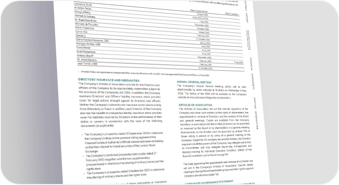 GOVERNANCE DIRECTORS’ REPORT CONTINUED S DIRECTORS TR Details of Directors who served throughout the year are set out in the table below. Daniel Li, Jean Tomlin and Cyrus Jilla will be offering themselves for A TE election in accordance with the Company’s Articles of Association at the 2024 AGM and all the remaining existing Directors will be offering themselves for G I re-election. C R Name Date of appointment Date of cessation E P Lawrence Stroll 20 April 2020 O R 1 T Amedeo Felisa 4 May 2022 as CEO Doug Lafferty 1 May 2022 Ahmed Al-Subaey 1 November 2022 G Sir Nigel Boardman 1 October 2022 O Michael de Picciotto 24 April 2020 VE Robin Freestone 1 February 2021 R Cyrus Jilla 27 October 2023 NAN Daniel Li 28 July 2023 C Dame Natalie Massenet, DBE 8 July 2021 E Marigay McKee, MBE 8 July 2021 Franz Reiner 8 July 2021 F I Scott Robertson 1 November 2022 NAN Antony Sheriff 1 February 2021 17 May 2023 C Dr. Anne Stevens 1 February 2021 IAL Jean Tomlin, OBE 27 October 2023 S T 1 Amedeo Felisa was appointed an Independent Non-executive Director on 8 July 2021 and was appointed Chief Executive OfÏcer on 4 May 2022. A T E M DIRECTORS’ INSURANCE AND INDEMNITIES ANNUAL GENERAL MEETING E N The Company’s Articles of Association provide for the Directors and The Company’s Annual General Meeting (AGM) will be held T S ofÏcers of the Company to be appropriately indemnified subject to electronically by audio webcast at 10.30am on Wednesday 8 May the provisions of the Companies Act 2006. In addition, the Company 2024. The Notice of the AGM will be available on the Company’s F maintains Directors’ and OfÏcers’ liability insurance, which provides website at www.astonmartinlagonda.com/investors. U R cover for legal actions brought against its Directors and ofÏcers. T H Neither the Company’s indemnity nor insurance covers claims arising ARTICLES OF ASSOCIATION E R from dishonesty or fraud. In addition, each Director of the Company The Articles of Association set out the internal regulation of the INF also has the benefit of prospectus liability insurance which provides Company and cover such matters as the rights of shareholders, the cover for liabilities incurred by Directors in the performance of their appointment or removal of Directors, and the conduct of the Board OR duties or powers in connection with the issue of the following and general meetings. Copies are available from the Company M A documents (as applicable): Secretary. In accordance with the Articles, Directors can be appointed T I or removed by the Board or by shareholders in a general meeting. ON – The Company’s prospectus dated 20 September 2018 in relation to Amendments to the Articles must be approved by at least 75% of the Company’s listing on the premium listing segment of the those voting in person or by proxy at a general meeting of the Financial Conduct Authority’s OfÏcial List and admission to trading Company. Subject to UK company law and the Articles, the Directors on the Main Market for listed securities of the London Stock may exercise all the powers of the Company, may delegate authorities Exchange. to Committees, and may delegate day-to-day management and – The Company’s combined prospectus and circular dated 27 decision-making to individual Executive Directors. Details of the February 2020 (together with the two supplementary Board Committees can be found on page 84. prospectuses) in relation to the placing of ordinary shares and the rights issue. The rules governing the appointment and removal of a Director are – The Company’s prospectus dated 5 September 2022 in relation to set out in the Company’s Articles of Association. Specific details the placing of ordinary shares and the rights issue. relating to the significant shareholder groups and their right to appoint Directors are set out on page 126. No amount was paid under any of these indemnities or insurances during the year other than the applicable insurance premiums. CORPORATE GOVERNANCE STATEMENT Under the Disclosure and Transparency Rules, a requirement exists for In accordance with Section 236 of the Companies Act 2006, qualifying a Corporate Governance Statement to be included in this Directors’ third-party indemnity provisions are in place for the Directors in Report. The corporate governance statement, explaining how the respect of liabilities incurred as a result of their ofÏce, to the extent Group complies with the Governance Code, is set out on page 82. A permitted by law. Both the insurance and indemnities applied description of the composition and operation of the Board and its throughout the year ended 31 December 2023 and up to the date of Committees is set out on pages 84-122. Other than the areas of non- this Report. compliance identified on page 82, the Company has complied ASTON MARTIN LAGONDA ANNUAL REPORT AND ACCOUNTS 2023 124