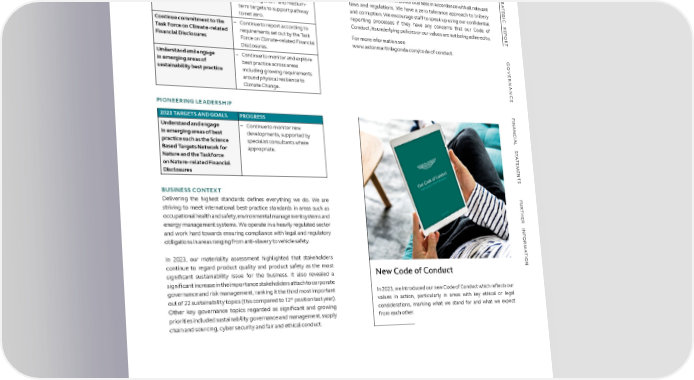 SS S TRTR EMBRACING INDUSTRY BEST PRACTICE Policy and standards TR AA A TETE 2023 TARGETS AND GOALS PROGRESS Our policy is to conduct all our business in accordance with all relevant TE GG G II Continue commitment to the – Work continues towards I CC laws and regulations. We have a zero tolerance approach to bribery C R R Science Based Targets initiative developing short- and medium- R and corruption. We encourage staff to speak up using our confidential EE term targets to support pathway E PP reporting processes if they have any concerns that our Code of P OO to net zero. O RR Conduct, its underlying policies or our values are not being adhered to. R TT Continue commitment to the – Continue to report according to T Task Force on Climate-related requirements set out by the Task For more information see Financial Disclosures Force on Climate-related Financial www.astonmartinlagonda.com/code of conduct. GG Disclosures. G OO O VEVE Understand and engage – Continue to monitor and explore VE RR in emerging areas of best practice across areas R NANNAN sustainability best practice including growing requirements NAN CC around physical resilience to C EE Climate Change. E FF PIONEERING LEADERSHIP F II I NANNAN 2023 TARGETS AND GOALS PROGRESS NAN CC C IALIAL Understand and engage – Continue to monitor new IAL S S in emerging areas of best developments, supported by S practice such as the Science specialist consultants where TT T AA Based Targets Network for appropriate. A TT T EE Nature and the Taskforce E MM M EE on Nature-related Financial E NN N TT Disclosures T SS S BUSINESS CONTEXT FF F UU Delivering the highest standards defines everything we do. We are U RR R TT striving to meet international best-practice standards in areas such as T HH H EE occupational health and safety, environmental management systems and E RR R INF INF energy management systems. We operate in a heavily regulated sector INF and work hard towards ensuring compliance with legal and regulatory OROR obligations in areas ranging from anti-slavery to vehicle safety. OR MM M AA A TT T II In 2023, our materiality assessment highlighted that stakeholders I ONON continue to regard product quality and product safety as the most ON New Code of Conduct significant sustainability issue for the business. It also revealed a significant increase in the importance stakeholders attach to corporate governance and risk management, ranking it the third most important In 2023, we introduced our new Code of Conduct which reflects our th out of 22 sustainability topics (this compared to 12 position last year). values in action, particularly in areas with key ethical or legal Other key governance topics regarded as significant and growing considerations, marking what we stand for and what we expect priorities included sustainability governance and management, supply from each other. chain and sourcing, cyber security and fair and ethical conduct. ASTON MARTIN LAGONDA ANNUAL REPORT AND ACCOUNTS 2023 57