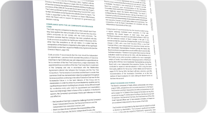 GOVERNANCE LEADERSHIP AND GOVERNANCE S Leadership and governance Cyrus Jilla representing Ernesto Bertarelli, a significant member of the TR Yew Tree Consortium) joining the Board in 2023. The Board needs to A balance the independence requirement with the overall size of the TE OVERVIEW G I Board in order to ensure that effective discussion and decision making C This Report sets out the Board’s corporate governance structures and is facilitated. The Board is now comprised of 15 Directors and the R work from 1 January 2023 to 31 December 2023. Together with the E Board has concluded, upon recommendation of the Nomination P Directors’ Remuneration Report on pages 108-122, it includes details O Committee, that to add further Independent Non-executive Directors R of how the Company has applied and complied with the principles and T could negatively impact the Board’s effectiveness. The Board is provisions of the 2018 UK Corporate Governance Code (the “Code”). confident that the independent decision making of the Board is not The Code is published by the Financial Reporting Council (“FRC”) and impacted by its Board composition as the Shareholder Representatives G further information can be found on its website (www.frc.org.uk). The are diverse and act independently of one another and the Independent O Code is supported by the FRC’s Guidance on Board Effectiveness, Non-executive Directors are all highly skilled and experienced. The VE which the Board uses to support its approach to governance and R decision-making. composition of all the Board Committees are compliant with the NAN independence requirements of the Code. C COMPLIANCE WITH THE UK CORPORATE GOVERNANCE Code provision 21 recommends that the chair should consider having E CODE a regular externally facilitated board evaluation. In FTSE 350 The Code requires companies to describe in their annual report how F companies this should happen at least every three years. I they have applied the main principles of the Code and also any areas The Board evaluation was due to be externally facilitated in 2021 but NAN where companies do not comply with the Code provisions. The with the extensive number of Board changes in the year it was C Directors consider that the Company has been compliant with the IAL considered that this would be of limited benefit. Due to more Board Code provisions as applied during the year ended 31 December 2023, S changes in 2022, with a new Chief Executive OfÏcer, a new Chief other than the exceptions as set out below. It is noted that the T Financial OfÏcer, a new Independent Non-executive Director and two A composition of the Board is impacted by the rights of the significant T new Shareholder Representative Directors joining the Board, the E shareholders under their respective Relationship Agreements (see the M Board concluded once again there would be little value in an externally E Directors’ Report, page 126). N facilitated evaluation. Therefore it was agreed that a rigorous internal T evaluation would be carried out for 2022, with the assistance of a S Code provision 9 recommends that the chair should be independent third-party survey which provided a platform for more meaningful on appointment. Lawrence Stroll assumed the position of Executive F Chairman in April 2020 and was not independent on appointment as analysis of results. Due to the further changing dynamics of the Board U R during 2023 with two more Shareholder Representatives joining the T he is a member of the Yew Tree Consortium, a major shareholder. His H Board and a new Independent Non-executive Director, the Board E appointment was a condition of the Yew Tree Consortium’s investment R in the Company and was in accordance with the Relationship concluded to repeat an internal evaluation in 2023 using the same INF Agreement entered into between the Company and the Yew Tree third-party platform for the survey. Further details can be found on Consortium. The Nomination Committee and the Board consider that pages 92-93. During 2024, the Board will take a decision, upon the OR recommendation of the Nomination Committee, as to the best M Lawrence Stroll has demonstrated objective judgement throughout A method of Board evaluation for 2024, taking all relevant factors at T I his tenure and him continuing in the role of Executive Chairman for the the time into account. ON foreseeable future is in the best interests of the Group and its stakeholders in order to utilise his proven leadership qualities and his EFFECTIVE BOARD AND ITS ROLE significant experience in building luxury brands. He has offered himself The Board is composed of highly skilled professionals who bring a for re-election every year since his appointment and shareholders range of skills, perspectives and corporate experience to the Board. have overwhelmingly voted in favour of his re-election. In the Board’s The Directors and their biographies and skills and experience are set opinion, the Company’s governance checks and balances are strong out on pages 76-79. Details of the changes to the Board during 2023 and effective: are set out on page 75. At the date of this Report the Board comprised – the Executive Chairman is subject to challenge from the Company’s 15 members: the Executive Chairman, the Chief Executive OfÏcer, the Senior Independent Director, the Executive Directors and the Chief Financial OfÏcer and 12 Non-executive Directors, of whom six are considered independent for the purposes of the Code. Independent Non-executive Directors; and – there is a clear division between the responsibilities of the The Directors are appointed by the Board and are subject to annual Executive Chairman, the Senior Independent Director, the Executive Directors and the Independent Non-executive Directors, re-election by shareholders. The Company’s significant shareholder which ensures accountability and oversight. groups, in line with the respective Relationship Agree