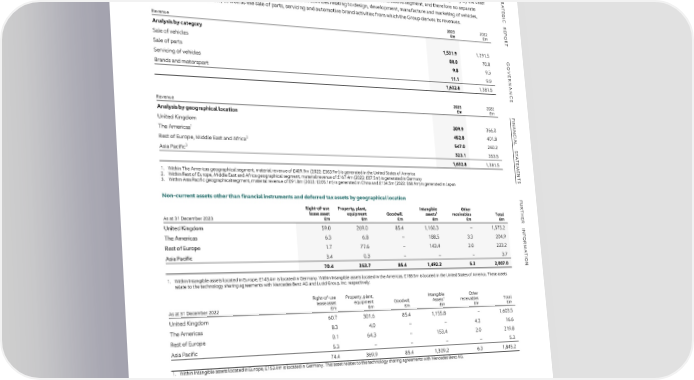 NOTES TO THE FINANCIAL STATEMENTS CONTINUED S S PRIOR YEAR RESTATEMENT TR3 SEGMENTAL REPORTING TR The Consolidated Statement of Financial Position as at 1 January 2022 and 31 December 2022 has been restated to reflect a prior period adjustment in AOperating segments are defined as components of the Group about which separate financial information is available and is evaluated regularly by the chief A respect of the deferral of tax relief income received under the Research and Development Expenditure Credit (‘RDEC’) regime. The Group previously TEoperating decision-maker in assessing performance. The Group has only one operating segment, the automotive segment, and therefore no separate TE G G I I recognised the income within Administrative and other operating expenses in the Consolidated Income Statement, in the period in which the qualifying Csegmental report is disclosed. The automotive segment includes all activities relating to design, development, manufacture and marketing of vehicles, C expenditure giving rise to the RDEC claim was incurred. The Group has reassessed the treatment under IAS 20 in respect of income from RDEC claims where Rincluding consulting services; as well as the sale of parts, servicing and automotive brand activities from which the Group derives its revenues. R E E the qualifying expenditure has been capitalised. For these capitalised expenses, the RDEC income earned has been deferred to the Consolidated Statement P P O 2023 2022 O of Financial Position and will be released to the Consolidated Income Statement over the same period as the amortisation of the costs capitalised to which RRevenue £m £m R the RDEC income relates. Where the qualifying expenditure is not capitalised, the RDEC income will continue to be recognised in the Consolidated Income TAnalysis by category T Statement in the year the expenditure is incurred, as has previously been the approach. Sale of vehicles 1,531.9 1,291.5 G G The impact of this adjustment is that as at 1 January 2022 and 31 December 2022, £49.0m of deferred income has been recognised on the balance sheet OSale of parts 80.0 70.8 O split between current £14.9m and non-current £34.1m Trade and Other Payables with a corresponding adjustment to retained earnings. There is no VEServicing of vehicles 9.8 9.3 VE R R adjustment to the Consolidated Income Statement for the year ended 31 December 2022 as the impact of the adjustment is not material to that individual NANBrands and motorsport 11.1 9.9 NAN year. There is no change to the Consolidated Statement of Cash Flows as, whilst the accounting impact of the claim is deferred, there is no change to the 1,632.8 1,381.5 C C timing of the cash receipt. No change in the corporation tax position is recognised for the year ended 31 December 2022 in either the Consolidated Income E E Statement or Consolidated Statement of Financial Position, as the recoverability assessment of the Group’s deferred tax position has not been materially changed by this restatement. As there is no adjustment to the Consolidated Income Statement and no change in the income tax position, there is no impact 2023 2022 Revenue £m £m F F on earnings per share. I I NAN Analysis by geographical location NAN United Kingdom 309.9 366.0 Where the notes included in these Consolidated Financial Statements provide additional analysis in respect of amounts impacted by the above restatement, C C IAL 1 IAL the comparative values presented have been re-analysed on a consistent basis. The following tables detail the impact on the Consolidated Statement of The Americas 452.8 401.8 S 2 S Financial Position as at 31 December 2022 and 2021, respectively. Rest of Europe, Middle East and Africa 547.0 260.2 T 3 T A Asia Pacific 323.1 353.5 A T T As previously reported Adjustment Restated balance E E 31 December 2022 31 December 2022 M 1,632.8 1,381.5 M E E Liabilities £m £m £m N1. Within The Americas geographical segment, material revenue of £409.9m (2022: £363.9m) is generated in the United States of America N T T S 2. Within Rest of Europe, Middle East and Africa geographical segment, material revenue of £167.4m (2022: £87.5m) is generated in Germany S Non-current liabilities Trade and other payables 9.1 34.1 43.2 3. Within Asia Pacific geographical segment, material revenue of £91.8m (2022: £205.1m) is generated in China and £134.5m (2022: £68.9m) is generated in Japan F F Non-current assets other than financial instruments and deferred tax assets by geographical location U U R R Current liabilities T Right-of-use Property, plant, Intangible Other T H 1 H lease asset equipment Goodwill assets receivables Total E E Trade and other payables 876.3 14.9 891.2 R As at 31 December 2023 £m £m £m £m £m £m R INF INF United Kingdom 59.0 269.0 85.4 1,160.3 – 1,575.2 Capital and reserves OR The Americas 6.3 6.8 – 188.5 3.3 204.9 OR Retained Earnings (1,184.9) (49.0) (1,233.9) M Rest of Europe 1.7 77.6 – 143.4 2.0 223.2 M A A T Asia Pacific 3.4 0.3 – – – 3.7 T I I ON 70.4 353.7 85.4 1,492.2 5.3 2,007.0 ON As previously reported Adjustment Restated balance 1 January 2022 1 January 2022 1. Within Intangible assets located in Europe, £143.4m is located in Germany. Within Intangible assets located in the Americas, £188.5m is located in the United States of America. These assets Liabilities £m £m £m relate to the technology sharing agreements with Mercedes Benz AG and Lucid Group, Inc. respectively. Non-current liabilities Trade and other payables 9.8 34.1 43.9 Right-of-use Property, plant, Intangible Other 1 lease asset equipment Goodwill Assets receivables Total As at 31 December 2022 £m £m £m £m £m £m Current liabilities United Kingdom 60.7 301.6 85.4 1,155.8 – 1,603.5 Trade and other payables 721.0 14.9 735.9 The Americas 8.3 4.0 – – 4.3 16.6 Rest of Europe 0.1 64.3 – 153.4 2.0 219.8 Capital and reserves Asia Pacific 5.3 – – – – 5.3 Retained Earnings (662.4) (49.0) (711.4) 74.4