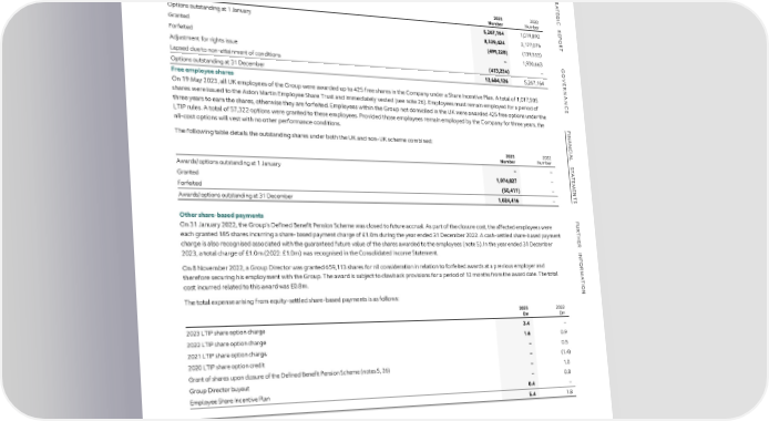 NOTES TO THE FINANCIAL STATEMENTS CONTINUED S S 28 ADDITIONAL CASH FLOW INFORMATION CONTINUED TR29 SHARE-BASED PAYMENTS CONTINUED TR Reconciliation of movements of select liabilities to cash flows arising from financing activities continued ALong-term incentive schemes continued A TE The following table details the outstanding options under the LTIP schemes: TE Other borrowings G G I I and inventory Lease $1,184.0m 10.5% $335m 15% C C arrangements Liabilities First Lien Notes Second Lien Notes Total R 2023 2022 R Liabilities £m £m £m £m £m Number Number E E P Options outstanding at 1 January 5,267,164 1,019,892 P O O At 1 January 2022 134.0 103.4 852.5 222.4 1,312.3 R R T Granted 8,329,424 2,177,076 T Changes from financing cash flows Interest paid (4.6) (4.5) (96.3) (35.8) (141.2) Forfeited (499,228) (139,533) Adjustment for rights issue – 1,930,663 G G Principal lease payment – (10.0) – – (10.0) O Lapsed due to non-attainment of conditions (413,234) – O Repayment of existing borrowings (7.8) – (36.1) (128.8) (172.7) VEOptions outstanding at 31 December 12,684,126 5,267,164 VE Premium paid on the early redemption of Senior Secured Notes – – – (14.3) (14.3) R R Inventory repurchase repayment (60.0) – – – (60.0) NANFree employee shares NAN On 19 May 2023, all UK employees of the Group were awarded up to 425 free shares in the Company under a Share Incentive Plan. A total of 1,017,505 Inventory repurchase drawdown 75.7 – – – 75.7 C C Transaction costs paid – – (1.9) – (1.9) Eshares were issued to the Aston Martin Employee Share Trust and immediately vested (see note 26). Employees must remain employed for a period of E three years to earn the shares, otherwise they are forfeited. Employees within the Group not domiciled in the UK were awarded 425 free options under the Total changes from financing cash flows 3.3 (14.5) (134.3) (178.9) (324.4) LTIP rules. A total of 57,322 options were granted to these employees. Provided those employees remain employed by the Company for three years, the F F Effect of changes in exchange rates – 0.7 113.5 42.7 156.9 I I New leases under IFRS 16 – 2.2 – – 2.2 NANnil-cost options will vest with no other performance conditions. NAN C The following table details the outstanding shares under both the UK and non-UK scheme combined: C Modifications to existing leases – 3.5 – – 3.5 IAL 2023 2022 IAL S S Interest expense 12.3 4.5 103.5 82.8 203.1 Number Number Movement in accrued interest 0.9 – (0.2) – 0.7 T T A Awards/options outstanding at 1 January – – A T T Financing expense in the Income Statement classified as operating cash flow (5.2) – – – (5.2) E E M Granted 1,074,827 – M E E Balance at 31 December 2022 145.3 99.8 935.0 169.0 1,349.1 N Forfeited (50,411) – N T T S Awards/options outstanding at 31 December 1,024,416 – S 29 SHARE-BASED PAYMENTS F Other share-based payments F Long-term incentive schemes U U R On 31 January 2022, the Group’s Defined Benefit Pension Scheme was closed to future accrual. As part of the closure cost, the affected employees were R On 24 May 2023, Executive Directors and certain other employees were granted conditional share awards under the Company’s Long-Term Incentive Plan T T H each granted 185 shares incurring a share-based payment charge of £1.0m during the year ended 31 December 2022. A cash-settled share-based payment H (“2023 LTIP”). On 12 December 2023, additional employees were granted conditional share awards under an extension to the same plan. The total charge E E R charge is also recognised associated with the guaranteed future value of the shares awarded to the employees (note 5). In the year ended 31 December R recognised in the Consolidated Income Statement in relation to this scheme was £3.4m (2022: £nil). INF2023, a total charge of £1.0m (2022: £1.0m) was recognised in the Consolidated Income Statement. INF On 13 and 14 June 2022, Executive Directors and certain other employees were granted conditional share awards under the Company’s Long-Term OROn 8 November 2022, a Group Director was granted 659,113 shares for nil consideration in relation to forfeited awards at a previous employer and OR Incentive Plan (“2022 LTIP”). On 15 December 2022, additional employees were granted conditional share awards under an extension to the same plan. The Mtherefore securing his employment with the Group. The award is subject to clawback provisions for a period of 12 months from the award date. The total M A A total charge recognised in the Consolidated Income Statement in relation to this scheme was £1.6m (2022: £0.9m). T T I cost incurred related to this award was £0.8m. I On 14 June 2021, Executive Directors and certain other employees were granted conditional share awards under the Company’s Long-Term Incentive Plan ON ON The total expense arising from equity-settled share-based payments is as follows: (“2021 LTIP”). On 14 December 2021, additional employees were granted conditional share awards under an extension to the same plan. The total charge recognised in the Consolidated Income Statement in relation to this scheme was £nil (2022: £0.4m). 2023 2022 £m £m Awards made under the 2020 LTIP lapsed during the year as the remaining qualifying criteria were not met. 2023 LTIP share option charge 3.4 – The fair value of equity-settled share options and share awards granted is estimated at the date of grant using share option valuation models. The schemes 2022 LTIP share option charge 1.6 0.9 are valued using the Monte Carlo model. 2021 LTIP share option charge – 0.5 The following tables list the inputs to the models for share based payment costs in the year: 2020 LTIP share option credit – (1.4) Grant of shares upon closure of the Defined Benefit Pension Scheme (notes 5, 26) – 1.0 2023 grant 2022 grant 2021 grant Group Director buyout – 0.8 of 2023 LTIP of 2022 LTIP of 2021 LTIP Aggregate fair value at measureme
