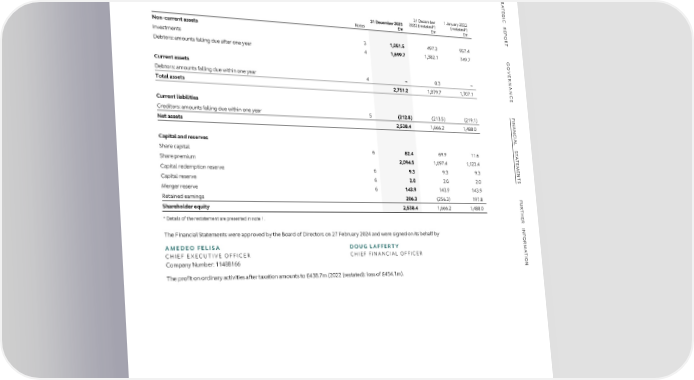 FFIINANNANCCIALIAL S STTAATTEEMMEENNTTSS PARENT COMPANY FINANCIAL STATEMENTS PARENT COMPANY FINANCIAL STATEMENTS S TR Parent Company Statement of Financial Position A TE as at 31 December 2023 G I C 31 December 1 January 2022 R E 31 December 2023 2022 (restated*) (restated*) P Notes £m £m £m O R Non-current assets T Investments 3 1,051.5 497.3 957.4 Debtors: amounts falling due after one year 4 1,699.7 1,382.1 749.7 G O VE Current assets R Debtors: amounts falling due within one year 4 – 0.3 – NAN Total assets 2,751.2 1,879.7 1,707.1 C E Current liabilities F I Creditors: amounts falling due within one year 5 (212.8) (213.5) (219.1) NAN Net assets 2,538.4 1,666.2 1,488.0 C IAL Capital and reserves S T Share capital 6 82.4 69.9 11.6 A T E Share premium 2,094.5 1,697.4 1,123.4 M E Capital redemption reserve 6 9.3 9.3 9.3 N T Capital reserve 6 2.0 2.0 2.0 S Merger reserve 6 143.9 143.9 143.9 Retained earnings 206.3 (256.3) 197.8 F U R y 2,538.4 1,666.2 1,488.0 T Shareholder equit H E * Details of the restatement are presented in note 1. R INF The Financial Statements were approved by the Board of Directors on 27 February 2024 and were signed on its behalf by OR AMEDEO FELISA DOUG LAFFERTY M A CHIEF EXECUTIVE OFFICER CHIEF FINANCIAL OFFICER T I Company Number: 11488166 ON The profit on ordinary activities after taxation amounts to £438.7m (2022 (restated): loss of £454.1m). ASTON MARTIN LAGONDA ANNUAL REPORT AND ACCOUNTS 2023 200