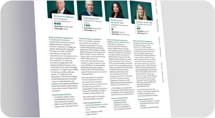 S S TR INDEPENDENT NON-EXECUTIVE DIRECTORS TR A A TE TE G G I I C C R R E E P P O O R R T T G G O O VE SIR NIGEL BOARDMAN ROBIN FREESTONE DAME NATALIE MARIGAY MCKEE, MBE VE R R NAN Senior Independent Independent Non-executive MASSENET, DBE Independent Non-executive NAN Non-executive Director Director Independent Non-executive Director C A N S A N R Director S N C E Appointed: October 2022 Appointed: February 2021 R Appointed: July 2021 E Nationality: British Nationality: British Appointed: July 2021 Nationality: British F Nationality: British/American F I I NAN NAN C Skills and relevant experience Skills and relevant experience Skills and relevant experience Skills and relevant experience C IAL Sir Nigel joined the Board in Natalie brings her wealth of luxury IAL Robin is a qualified chartered Marigay has extensive retail sales, S October 2022 and became Senior accountant, with significant retail sales, marketing and marketing and luxury brand S T Independent Non-executive financial, management, business commercial experience to the experience. In 2018, Marigay T A A T Director in May 2023. Sir Nigel was transformation and diversification Board. Natalie is the co-founder co-founded Fernbrook Capital LLC, T E E M partner at the law firm Slaughter experience within leading UK-listed and managing partner of Imaginary a venture fund based in New York M E E N and May from 1982 until 2019 global businesses. Previously, Robin Ventures, a capital firm focusing on and Los Angeles, specialising in N T specialising in mergers and held a number of senior executive innovations at the intersection of consumer tech. Marigay started her T S acquisitions and corporate advisory retail and technology. Previously, S finance roles in the industrial sector career at Estée Lauder in Europe, and remained a consultant at the Natalie revolutionised luxury retail (1985-2004) with ICI plc, and then joined Harrods in 1999 as F firm until 2022. Sir Nigel was Amersham International plc and when she founded Net-a-Porter in Head of its beauty department. In F U awarded a Knighthood in the Henkel Ltd where he was the Chief 1999, and subsequently, the Outnet her 14 years at Harrods, she spent U R R T Queen’s Birthday Honours List in Financial OfÏcer. He subsequently and Mr Porter growing the group of the last six years as Chief Merchant T H H E June 2022 for services to the legal joined the publishing company brands into one of the world’s most OfÏcer where she developed and E R R INF profession. Sir Nigel is Chair of Help Pearson plc in 2004, the last nine influential fashion businesses. executed a strategic vision to make INF for Heroes, a military veterans years of which he served as its Chief Natalie has also held several Harrods the gold standard for the OR charity, is Trustee and Chair Financial OfÏcer. non-executive and advisory exclusive launch of luxury and OR M designate of The Medical College Robin has wide Non-executive positions as a Director of NuOrder premium brands. In 2013, Marigay M A of Saint Bartholomew’s Hospital Inc (2021), a Director and Co- joined Saks Fifth Avenue in New A T Director experience and was T I I ON Trust, is Trustee Emeritus and previously a Non-executive Chairman of Farfetch Inc (2017- York as its President rebuilding ON member of the audit committee for Director at eChem Limited, Chair of 2020) and the Chairman of British Saks’ luxury launch platform for the British Museum and is Deputy the 100 Group and Senior Fashion Council (2012-2017). new and emerging and Chair of the London Philharmonic Independent Director and Chair of In 2016 Natalie was made Dame international brands. Orchestra. the Audit Committee of Cable & Commander of the British Empire in In the 2022 Queen’s New Year Wireless Communications plc. recognition of her contributions to Honours List, Marigay was awarded External appointments – Arbuthnot Latham (Chair) Robin holds a BA in Economics the UK fashion and retail industry. an MBE in recognition of her – Arbuthnot Banking Group from Manchester University. services to British retail overseas. External appointments (Non-executive Director) – Imaginary Ventures – Mile Group Unlimited (Chair) External appointments External appointments – Glyde Group Unlimited (Chair) – Moneysupermarket.com (Chair (Managing Partner) – Fernbrook Capital LLC (Director) and Nomination Committee – Everlane Inc (Director) – EShopWorld (Advisory Council – EON Group Holdings Inc Member) Chair) – Capri Holdings Limited (Non-executive Director) – The Webster (Board Member) (Lead Director) ASTON MARTIN LAGONDA ANNUAL REPORT AND ACCOUNTS 2023 77