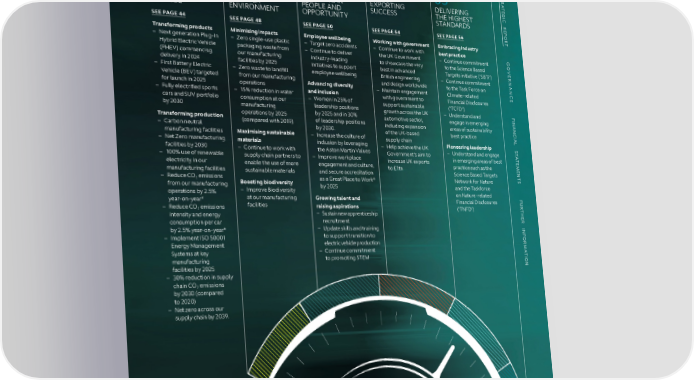 2023 TARGETS AND GOALS S S TR TR A A TE 01 02 03 04 05 TE G G I TACKLING CREATING INVESTING IN EXPORTING DELIVERING I C C R CLIMATE A BETTER PEOPLE AND SUCCESS THE HIGHEST R E CHANGE ENVIRONMENT OPPORTUNITY STANDARDS E P P O O R SEE PAGE 44 SEE PAGE 48 SEE PAGE 50 SEE PAGE 54 SEE PAGE 56 R T T Transforming products Minimising impacts Employee wellbeing Working with government Embracing industry – Next generation Plug-In – Zero single-use plastic – Target zero accidents – Continue to work with best practice G Hybrid Electric Vehicle packaging waste from – Continue to deliver the UK Government G O – Continue commitment O VE (PHEV) commencing our manufacturing industry-leading to showcase the very to the Science Based VE R delivery in 2024 facilities by 2025 initiatives to support best in advanced Targets initiative (‘SBTi’) R NAN – First Battery Electric – Zero waste to landfill employee wellbeing British engineering – Continue commitment NAN Vehicle (BEV) targeted from our manufacturing and design worldwide to the Task Force on C for launch in 2025 operations Advancing diversity – Maintain engagement C E Climate-related E – Fully electrified sports – 15% reduction in water and inclusion with government to – Women in 25% of Financial Disclosures cars and SUV portfolio consumption at our support sustainable leadership positions (‘TCFD’) F by 2030 manufacturing growth across the UK – Understand and F I I NAN operations by 2025 by 2025 and in 30% automotive sector, NAN Transforming production engage in emerging (compared with 2019) of leadership positions including expansion areas of sustainability C – Carbon neutral by 2030. C IAL manufacturing facilities Maximising sustainable – Increase the culture of of the UK-based best practice IAL S – Net Zero manufacturing materials inclusion by leveraging supply chain Pioneering leadership S – Help achieve the UK T T A facilities by 2030 – Continue to work with the Aston Martin Values Government’s aim to – Understand and engage A T T E – 100% use of renewable supply chain partners to – Improve workplace increase UK exports in emerging areas of best E M electricity in our enable the use of more engagement and culture, practice such as the M E to £1tn E N manufacturing facilities sustainable materials and secure accreditation Science Based Targets N T T S – Reduce CO emissions as a Great Place to Work® Network for Nature S 2 Boosting biodiversity from our manufacturing – Improve Biodiversity by 2025 and the Taskforce operations by 2.5% on Nature-related F at our manufacturing Growing talent and F U year-on-year* Financial Disclosures U R facilities raising aspirations R T – Reduce CO emissions (‘TNFD’) T 2 H – Sustain new apprenticeship H E intensity and energy E R recruitment R INF consumption per car – Update skills and training INF by 2.5% year-on-year* OR – Implement ISO 50001 to support transition to OR electric vehicle production M Energy Management M A Systems at key – Continue commitment A T T I to promoting STEM I ON manufacturing ON facilities by 2025 – 30% reduction in supply chain CO emissions 2 by 2030 (compared to 2020) – Net zero across our supply chain by 2039. * Scope 1 CO emissions 2 ASTON MARTIN LAGONDA ANNUAL REPORT AND ACCOUNTS 2023 43