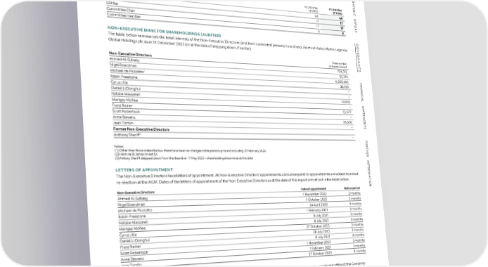 GOVERNANCE DIRECTORS’ REMUNERATION REPORT CONTINUED S SUMMARY OF NON-EXECUTIVE DIRECTORS’ FEES FOR FY 2024 TR The table below sets out the annual fee structure for the NEDs for 2024 (there are no changes to the fee levels that applied in 2023). A TE G FY 2023 fee FY 2024 fee I NED role (£’000s) (£’000s) C Basic NED fee 65 65 R E P SID fee 17 17 O R Committee Chair 17 17 T Committee member 6 6 G NON-EXECUTIVE DIRECTOR SHAREHOLDINGS (AUDITED) O The table below summarises the total interests of the Non-Executive Directors (and their connected persons) in ordinary shares of Aston Martin Lagonda VE Global Holdings plc as at 31 December 2023 (or at the date of stepping down, if earlier). R NAN Total number 1 C Non-Executive Directors of shares owned Ahmed Al-Subaey 704,312 E Nigel Boardman 50,376 2 6,285,660 F Michael de Picciotto I Robin Freestone 38,929 NAN Cyrus Jilla – C Daniel Li Donghui – IAL Natalie Massenet 20,000 S Marigay McKee – T A Franz Reiner 13,477 T E Scott Robertson – M E Anne Stevens 35,000 N T Jean Tomlin – S Former Non-Executive Directors 3 – Anthony Sheriff F U R Notes: T (1) Other than those stated below, there have been no changes in the period up to and including 27 February 2024 H E (2) Held via St James Invest SA R (3) Antony Sheriff stepped down from the Board on 17 May 2023 – shareholding shown is as at this date INF LETTERS OF APPOINTMENT OR The Non-Executive Directors have letters of appointment. All Non-Executive Directors’ appointments and subsequent re-appointments are subject to annual M A T re-election at the AGM. Dates of the letters of appointment of the Non-Executive Directors as at the date of this report are set out in the table below. I ON Non-Executive Directors Date of appointment Notice period Ahmed Al-Subaey 1 November 2022 3 months Nigel Boardman 1 October 2022 3 months Michael de Picciotto 24 April 2020 3 months Robin Freestone 1 February 2021 3 months Natalie Massenet 8 July 2021 3 months Marigay McKee 8 July 2021 3 months Cyrus Jilla 27 October 2023 3 months Daniel Li Donghui 28 July 2023 3 months Franz Reiner 8 July 2021 3 months Scott Robertson 1 November 2022 3 months Anne Stevens 1 February 2021 3 months Jean Tomlin 27 October 2023 3 months The terms and conditions of appointment for Non-Executive Directors are available for inspection by shareholders at the registered ofÏce of the Company. ASTON MARTIN LAGONDA ANNUAL REPORT AND ACCOUNTS 2023 120