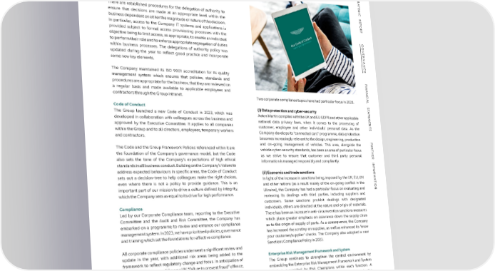 S S TR The Group Framework Policies are supplemented by functional CODE OF CONDUCT: HIGH INTEGRITY. TR A policies, procedures and standards which move away from principles HIGH PERFORMANCE A TE TE G to address specific actions and requirements. These are added to and G I I C enhanced as laws change and practice evolves. C R R E E P There are established procedures for the delegation of authority to P O O R ensure that decisions are made at an appropriate level within the R T business dependent on either the magnitude or nature of the decision. T In particular, access to the Company IT systems and applications is G provided subject to formal access provisioning processes with the G O objective being to limit access, as appropriate, to enable an individual O VE to perform their role and to enforce appropriate segregation of duties VE R R NAN within business processes. The delegations of authority policy was NAN updated during the year to reflect good practice and incorporate C C E some new key elements. E The Company maintained its ISO 9001 accreditation for its quality F F I management system which ensures that policies, standards and I NAN procedures are appropriate for the business, that they are reviewed on NAN C a regular basis and made available to applicable employees and C IAL contractors through the Group intranet. IAL S Two corporate compliance topics have had particular focus in 2023. S T T A Code of Conduct A T (i) Data protection and cyber-security T E The Group launched a new Code of Conduct in 2023, which was E M Aston Martin complies with the UK and EU GDPR and other applicable M E developed in collaboration with colleagues across the business and E N national data privacy laws, when it comes to the processing of N T approved by the Executive Committee. It applies to all companies T S within the Group and to all directors, employees, temporary workers customer, employee and other individuals’ personal data. As the S Company develops its “connected cars” programme, data protection and contractors. becomes increasingly relevant to the design, engineering, production F F U and on-going management of vehicles. This area, alongside the U R R T The Code and the Group Framework Policies referenced within it are vehicle cyber-security standards, has been an area of particular focus T H H E the foundation of the Company’s governance model, but the Code as we strive to ensure that customer and third party personal E R R INF also sets the tone of the Company’s expectations of high ethical information is managed responsibly and compliantly. INF standards in all business conduct. Building on the Company’s Values to OR address expected behaviours in specific areas, the Code of Conduct (ii) Economic and trade sanctions OR M sets out a decision-tree to help colleagues make the right choices, M A In light of the increase in sanctions being imposed by the UK, EU, UN A T even where there is not a policy to provide guidance. This is an T I and other nations (as a result mainly of the on-going conflict in the I ON ON important part of our mission to drive a culture defined by integrity, Ukraine), the Company has had a particular focus on evaluating and which the Company sees as equal to its drive for high performance. reviewing its dealings with third parties, including suppliers and customers. Some sanctions prohibit dealings with designated Compliance individuals, others are directed at the nature and origin of materials. Led by our Corporate Compliance team, reporting to the Executive There has been an increase in anti-circumvention sanctions measures Committee and the Audit and Risk Committee, the Company has which place greater emphasis on assurance down the supply chain embarked on a programme to review and enhance our compliance as to the origin of supply of parts. As a consequence, the Company management system. In 2023, we have prioritised policies, governance has increased the scrutiny on supplies, as well as enhanced its ‘know and training which set the foundations for effective compliance. your customer/supplier’ checks. The Company also adopted a new Sanctions Compliance Policy in 2023. All corporate compliance policies underwent a significant review and update in the year, with additional risk areas being added to the Enterprise Risk Management Framework and System framework to reflect regulatory change and focus. In anticipation of The Group continues to strengthen the control environment by the coming into force of the new UK “failure to prevent fraud” offence, embedding the Enterprise Risk Management Framework and System fraud risk and prevention has been incorporated into a Framework which is supported by Risk Champions within each function. A Policy. Compliance training courses have been reviewed and new summary of the key risk management activities undertaken by the programmes put in place, tailored to the specific audiences. Group is included within the Risk and Viability Report on page 70. The Internal Audit & Risk Management function is responsible for The Company is committed to conducting all business in an honest administering the Enterprise Risk Management Framework and and ethical manner. The Company expects all employees – and anyone System and for providing independent assurance to the Board, the carrying out work on behalf of the Company – to not only comply with Committee and senior management. the law but also to always maintain the highest standards of ethical business conduct and personal behaviour. ASTON MARTIN LAGONDA ANNUAL REPORT AND ACCOUNTS 2023 103