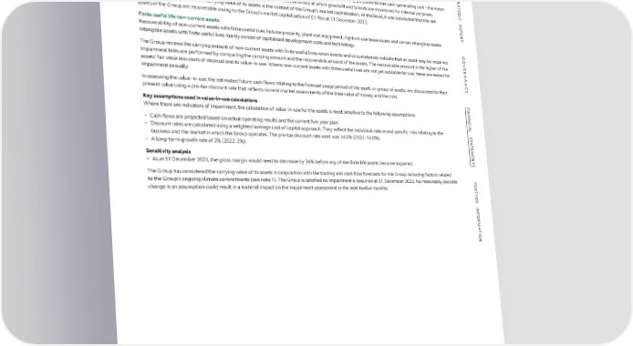 FFIINANNANCCIALIAL S STTAATTEEMMEENNTTSS NOTES TO THE FINANCIAL STATEMENTS CONTINUED S 13 IMPAIRMENT TESTING TR Indefinite useful life non-current assets A Goodwill and brands acquired through business combinations have been allocated for impairment testing purposes to one cash-generating unit – the Aston TE G I Martin Lagonda Group business. This represents the lowest level within the Group at which goodwill and brands are monitored for internal purposes. C The Group has considered the carrying value of its assets in the context of the Group’s market capitalisation. At this level, it was concluded that the net R E assets of the Group are recoverable owing to the Group’s market capitalisation of £1.9bn at 31 December 2023. P O R Finite useful life non-current assets T Recoverability of non-current assets with finite useful lives include property, plant and equipment, right-of-use lease assets and certain intangible assets. Intangible assets with finite useful lives mainly consist of capitalised development costs and technology. G O The Group reviews the carrying amount of non-current assets with finite useful lives when events and circumstances indicate that an asset may be impaired. VE Impairment tests are performed by comparing the carrying amount and the recoverable amount of the assets. The recoverable amount is the higher of the R assets’ fair value less costs of disposal and its value-in-use. Where non-current assets with finite useful lives are not yet available for use, these are tested for NAN impairment annually. C In assessing the value-in-use, the estimated future cash flows relating to the forecast usage period of the asset, or group of assets, are discounted to their E present value using a pre-tax discount rate that reflects current market assessments of the time value of money and the risks. F I Key assumptions used in value-in-use calculations NAN Where there are indicators of impairment, the calculation of value-in-use for the assets is most sensitive to the following assumptions: C – Cash flows are projected based on actual operating results and the current five-year plan. IAL – Discount rates are calculated using a weighted average cost of capital approach. They reflect the individual nature and specific risks relating to the S T business and the market in which the Group operates. The pre-tax discount rate used was 14.0% (2022: 14.0%). A T – A long-term growth rate of 2% (2022: 2%) E M E Sensitivity analysis N T – As at 31 December 2023, the gross margin would need to decrease by 36% before any of the finite life assets become impaired. S The Group has considered the carrying value of its assets in conjunction with the trading and cash flow forecasts for the Group including factors related to the Group’s ongoing climate commitments (see note 1). The Group is satisfied no impairment is required at 31 December 2023. No reasonably possible F U change in an assumption could result in a material impact on the impairment assessment in the next twelve months. R T H E R INF OR M A T I ON ASTON MARTIN LAGONDA ANNUAL REPORT AND ACCOUNTS 2023 166