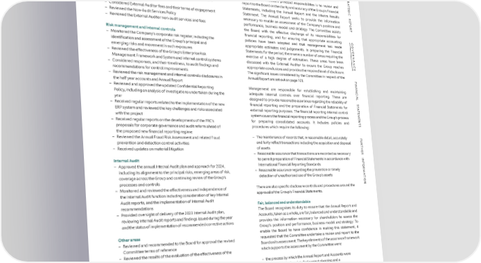 GOVERNANCE AUDIT AND RISK COMMITTEE REPORT CONTINUED S External audit Financial reporting and significant financial judgements and TR – Assessed the External Auditor’s independence, objectivity and estimates A TE effectiveness One of the Committee’s principal responsibilities is to review and G I – Considered and recommended to the Board the reappointment report to the Board on the clarity and accuracy of the Group’s Financial C of the External Auditor Statements, including the Annual Report and the Interim Results R E – Considered External Auditor fees and their terms of engagement Statement. The Annual Report seeks to provide the information P O – Reviewed the Non-Audit Services Policy necessary to enable an assessment of the Company’s position and R – Reviewed the External Auditor non-audit services and fees performance, business model and strategy. The Committee assists T the Board with the effective discharge of its responsibilities for Risk management and internal controls financial reporting, and for ensuring that appropriate accounting G – Monitored the Company’s corporate risk register, including the policies have been adopted and that management has made O VE identification and assessment of the Group’s principal and appropriate estimates and judgements. In preparing the Financial R emerging risks and movement in such exposures Statements for the period, there were a number of areas requiring the NAN – Reviewed the effectiveness of the Group’s Enterprise Risk exercise of a high degree of estimation. These areas have been C Management Framework and System and internal control systems discussed with the External Auditor to ensure the Group reaches E – Considered responses, and their timeliness, to audit findings and appropriate conclusions and provides the required level of disclosure. recommendations for control improvements The significant issues considered by the Committee in respect of the F – Reviewed the risk management and internal controls disclosures in Annual Report are set out on page 101. I the half year accounts and Annual Report NAN – Reviewed and approved the updated Confidential Reporting Management are responsible for establishing and maintaining C IAL Policy, including an analysis of investigations undertaken during the adequate internal controls over financial reporting. These are year designed to provide reasonable assurance regarding the reliability of S T – Received regular reports related to the implementation of the new financial reporting and the preparation of Financial Statements for A T ERP system and reviewed the key challenges and risks associated external reporting purposes. The financial reporting internal control E M with the project system covers the financial reporting process and the Group’s process E N – Received regular reports on the developments of the FRC’s for preparing consolidated accounts. It includes policies and T proposals for corporate governance and audit reform ahead of procedures which require the following: S the proposed new financial reporting regime – The maintenance of records that, in reasonable detail, accurately F – Reviewed the Annual Fraud Risk Assessment and related fraud U and fairly reflect transactions including the acquisition and disposal R prevention and detection control activities T of assets H – Received updates on material litigation E R – Reasonable assurance that transactions are recorded as necessary INF Internal Audit to permit preparation of Financial Statements in accordance with – Approved the annual Internal Audit plan and approach for 2024, International Financial Reporting Standards OR including its alignment to the principal risks, emerging areas of risk, – Reasonable assurance regarding the prevention or timely M A coverage across the Group and continuing review of the Group’s detection of unauthorised use of the Group’s assets T I processes and controls ON – Monitored and reviewed the effectiveness and independence of There are also specific disclosure controls and procedures around the the Internal Audit function including consideration of key Internal approval of the Group’s Financial Statements. Audit reports, and the implementation of Internal Audit Fair, balanced and understandable recommendations The Board recognises its duty to ensure that the Annual Report and – Provided oversight of delivery of the 2023 Internal Audit plan, Accounts, taken as a whole, are fair, balanced and understandable and reviewing Internal Audit reports and findings issued during the year provides the information necessary for shareholders to assess the and the status of implementation of recommended corrective actions Group’s position and performance, business model and strategy. To Other areas enable the Board to have confidence in making this statement, it – Reviewed and recommended to the Board for approval the revised requested that the Committee undertake a review and report to the Committee terms of reference Board on its assessment. The key elements of the assurance framework – Reviewed the results of the evaluation of the effectiveness of the which supports the assessment by the Committee were: Committee – the process by which the Annual Report and Accounts were – Approved TCFD disclosures for the Annual Report prepared, including detailed project planning and a – Received an update on tax matters for the Group and reviewed and recommended to the Board approval of the Group’s annual tax comprehensive review process; strategy and publication on the Company website – review of the drafting and verification processes for the Annual – Received a treasury update Report and Accounts by the Disclosure Committee; – Received a pension strategy update – comprehensive reviews undertaken by the Executive Directors, members of the Executive Committee and other members of senior management comprising the Annual Report and Accounts draf