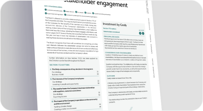 STRATEGIC REPORT SECTION 172 STATEMENT S TR A Key decisions and TE G I C R stakeholder engagement E P O R KEY STAKEHOLDERS T 1 2 3 4 5 Customers and enthusiasts Dealer network Our people Investors Suppliers and other partnerships G O 6 Government and regulators 7 Local communities and Non-Governmental Organisations VE R The Board is pleased to provide a statement that supports Section 172 of NAN the Companies Act 2006. This requires that Directors promote the success Investment by Geely C of the Company for the benefit of the members as a whole, taking into Section 172 matters A, C, E, F E account the interests of the Company’s stakeholders in its decision- making. A description of the Company’s key stakeholders, what matters to Stakeholders considered 4 5 F them and how the Group, including the Board engages with them is set I out on pages 24-27. Some of the key decisions that the Board made during NAN PRINCIPAL DECISION the year and how it took the interests of stakeholders into account in C making those decisions are set out on the following pages. The Board approved the issue of 28 million new ordinary shares at IAL 335 pence per share equating to £95m in cash. The Board further S approved the Company entering into a new Relationship Agreement T The Board recognises that there will sometimes be competing priorities A with Geely giving it the right to appoint a Shareholder T and interests between the stakeholder groups but aims to assess and E Representative Non-executive Director to the Board. M balance those interests to make decisions which are conducive to the long- E N term success of the business, in line with the Company’s reputation for high T standards of business conduct and the Company’s values. CONSIDERING OUR STAKEHOLDERS S Investors: Whilst the issue of shares to Geely was dilutive to our shareholders, the Board considered the transaction to be in the best F Further information on how Section 172(1) has been applied by U interests of shareholders as a whole for creation of long-term value. R the Directors can be found throughout the Report T H E Suppliers and partnerships: The relationship with Geely provides the R SECTION 172 MATTERS Company with the opportunity to better understand the strategic INF A. The likely consequences of any decision in the long term growth market that China represents, as well as the opportunity to OR Our strategy 32 access Geely’s range of technologies and components. M A Business model 30 T I B. The interests of the Company’s employees OUTCOME ON Geely’s stake increased from 7% to 16%. Our strategy 32 Investing in people and opportunity 50 A Relationship Agreement is in place between the Company and C. The need to foster the Company’s business relationships Geely with a Geely Shareholder Representative Non-executive with suppliers, customers and others Director being an important part of the strategic relationship . Our strategy 32 The Company’s relationship with Geely provides better access to Exporting success 54 understanding the growth market of China. D. T he impact of the Company’s operations on the community The relationship provides the potential for future use of Geely’s and the environment products. Tackling climate change 44 Creating a better environment 48 E. The desirability of the Company maintaining a reputation for high standards of business conduct Leadership and governance 82 This transaction enables the creation of Risk management 64 a long-term partnership with Geely and Delivering the highest standards 56 the exploration of joint technology F. The need to act fairly as between members of the Company synergies and new growth Investor engagement 90 opportunities” Leadership and governance 82 ASTON MARTIN LAGONDA ANNUAL REPORT AND ACCOUNTS 2023 28