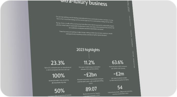 STRATEGIC REPORT ENVIRONMENTAL, SOCIAL AND GOVERNANCE S TR A Building a sustainable TE G I C R ultra-luxury business E P O R T G O VE R Our journey building a world-leading sustainable ultra-luxury automotive business continues. It is a key NAN focus of our corporate strategy and the central objective of our sustainability strategy, Racing. Green. C E Racing. Green. is built on five priority areas that reflect Aston Martin’s approach to sustainability aligned with the United Nation’s Sustainable Development Goals, and a deep understanding of the priorities that F our customers, employees and other stakeholders care about. I NAN These five areas are tackling climate change; creating a better environment; investing in people C IAL and opportunity; exporting success; and delivering the highest standards. S T A T E M E N T S 2023 highlights F U R T H E R INF OR M 23.3% 11.2% 63.6% A T I Fall in CO emissions per car manufactured Decrease in total energy consumption Waste recycled in 2023, compared ON 2 e)* between 2022 and 2023 (MWh) with 58.8% in 2022 (tonnes) in 2023 compared with 2022 (tCO2 100% ~£2bn ~£2m Renewable electricity powering Planned investment in advanced technologies Sale value of vehicles donated all manufacturing sites over the next 5 years, with investment shifting by Aston Martin to auction for charity to BEV 50% 89.07 54 Increase in the proportion of women Biodiversity score for Gaydon, Visits to local schools, colleges and universities, in our early careers intake compared with 88.87 in 2022 more than double total in 2022 24.5% Improvement in Accident Frequency Rate compared with 2022 ASTON MARTIN LAGONDA ANNUAL REPORT AND ACCOUNTS 2023 42