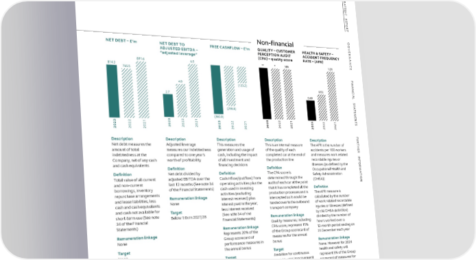 S S TR TR A A TE TE G G I I C C R R E E P P O O R R T T G G O O FinancialVE Non-financial VE R R REVENUE – £’mWHOLESALE VOLUMES OPERATING PROFIT/ADJUSTED EBITDA NANNET DEBT – £’mNET DEBT TO FREE CASHFLOW – £’m QUALITY – CUSTOMER HEALTH & SAFETY – NAN – units(LOSS) – £’m– £’m ADJUSTED EBITDA – PERCEPTION AUDIT ACCIDENT FREQUENCY C “adjusted leverage” (CPA) – quality score RATE – (AFR) C E 891.6 6.5 ** * NM 1.01 E 814.3 765.5 F F I I NAN NAN 4.0 (123.2) C C IAL 2.7 0.53 IAL S 0.40 S T T A A T T E (298.8) E M M E E N (360.0) N T 3 2 1 3 2 1 T S 3 2 1 2 2 2 3 2 1 2 2 2 3 2 1 S 2 2 2 0 0 0 2 2 2 0 0 0 2 2 2 0 0 0 2 2 2 0 0 0 2 2 2 0 0 0 2 2 2 2 2 2 2 2 2 F F U U DescriptionDescriptionDescriptionDescription RDescriptionDescription Description Description Description R T T Revenue measures the This measures sales from Operating profit/(loss) This measures our HNet debt measures the Adjusted leverage This measures the This is an internal measure The AFR is the number of H E E appeal of our brands, our the Company to its dealers measures our actual, underlying operating Ramount of total measures our indebtedness generation and usage of of the quality of each accidents per 100 workers R INF completed car at the end of INF ability to build and sustain and direct customersreported operating profitability, stripping out indebtedness at the compared to one year’s cash, including the impact and measures work related profitabilitythe impact of adjusting of all investment and the production line brand equity and increase Company, net of any cash worth of profitability recordable injuries or Definitionitems from operating OR OR market share through and cash equivalents financing decisions illnesses (as defined by the product expansionNumber of vehicles, Definitionprofit/(loss) and interest, MDefinition Definition Occupational Health and M including Specials, sold by Net revenue, less Cost ADefinitionNet debt divided by Definition The CPA score is A tax, depreciation and T Safety Administration T I I Definitionthe Company to its dealers of Sales, less all other amortisationONTotal value of all current adjusted EBITDA over the Cash inflow/(outflow) from determined through the ON Revenue is defined in note 2 and direct customersoperational expenses and non-current last 12 months (See note 34 operating activities plus the audit of each car at the point (OHSA)) that it has completed all the (See note 4 of the Financial Definition cash used in investing of the Financial StatementsRemuneration linkage borrowings, inventory of the Financial Statements) Definition production processes and is Remuneration linkageRepresents 7.5% of the Statements)Adjusted EBITDA is defined repurchase arrangements Remuneration linkageactivities (excluding The AFR measure is in note 34 of the Financial intercepted as it would be NoneGroup scorecard of Remuneration linkageand lease liabilities, less None interest received) plus calculated by the number performance measures for NoneStatementscash and cash equivalents interest paid in the year, handed over to the outbound of work related recordable Targetthe annual bonusRemuneration linkage and cash not available for Target less interest received transport company injuries or illnesses (defined The Company expects to TargetRepresents 50% of the short-term use (See note Below 1.0x in 2027/28(See note 34 of the Remuneration linkage by the OHSA definition) generate revenue of TargetNot applicableGroup scorecard of 34 of the Financial Financial Statements) Quality measures, including divided by the number of High single-digit % growth Statements) hours worked over a c. £2.5bn by 2027/28performance measures for Remuneration linkage CPA score, represent 15% 12-month period ending on in 2024 with continued the annual bonusRemuneration linkage Represents 20% of the of the Group scorecard of 31 December each year focus on value None Group scorecard of measures for the annual Target performance measures in bonus Remuneration linkage The Company expects to Target the annual bonus None. However for 2024 generate c. £800m None Target health and safety will adjusted EBITDA by Target Ambition for continuous represent 5% of the Group 2027/28 The Company expects to year-on-year improvement scorecard of measures for be sustainably free in CPA scores for GT/ the annual bonus cashflow positive from sports cars and DBX H2 2024 Target * Significant progress made but stretching target level Ambition for continuous not fully achieved. year-on-year reduction ** One of two targets achieved LINK TO STRATEGY:LINK TO STRATEGY:LINK TO STRATEGY:LINK TO STRATEGY:LINK TO STRATEGY:LINK TO STRATEGY:LINK TO STRATEGY:LINK TO STRATEGY: LINK TO STRATEGY: 12121212 1 2 1 2 1 2 1 3 4 1 2 4 ASTON MARTIN LAGONDA ANNUAL REPORT AND ACCOUNTS 2023 35