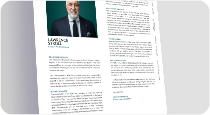 EXECUTIVE CHAIRMAN’S INTRODUCTION TO GOVERNANCE SS S TRTR In October we announced the appointment of Jean Tomlin as an TR AA Independent Non-executive Director and member of the Nomination A TETE Committee. Jean’s HR background combined with her luxury and TE GG G II I CC automotive sector experience will be of great benefit to the Board and C R R I look forward to working with Jean in the year ahead. R EE E PP P OO O RR BOARD INDEPENDENCE R TT The composition of our Board is unique. With the Board changes T during the year, we now have seven Shareholder Representative GG Directors on the Board. As a result, we no longer meet the G OO independence requirements of the UK Corporate Governance Code. O VEVE However, I am comfortable that this does not present a governance VE RR R NANNAN issue. Our Shareholder Representative Directors are diverse and act NAN independently of one another and all our Independent Non-executive CC C EE Directors are highly experienced. To comply with the independence E requirements of the Code would make our Board unwieldy and we need to maintain the Board at such a size to continue to promote FF F II effective discussion and decision making. I NANNAN NAN CC BOARD DIVERSITY C IALIAL Recognising the unique composition of our Board, our Board Diversity IAL S S LAWRENCE Policy states that we seek to achieve and maintain 40% of Board S TT T AA STROLL positions which are not subject to shareholder appointments to be A TT T EE EXECUTIVE CHAIRMAN held by women. That percentage is currently 50%. Of our total Board E MM M EE positions, 27% are held by women. The Board is committed to E NN N TT achieving and maintaining diversity at Board level and throughout the T SS business and will continue to monitor the progress being made. S DEAR SHAREHOLDER FF F UU I am pleased to introduce the Governance section of this year’s Annual BOARD EVALUATION U RR R TT Report. In this section we provide detail on the Board’s roles and Due to the composition of the Board significantly changing again this T HH H EE responsibilities, an overview of the activities of the Board and our year, we decided to undertake an internal Board evaluation again with E RR R INF INF Committees over the year and our compliance with the UK Corporate the assistance of a third-party provider which assisted with the INF Governance Code. questionnaires and the analysis of the results and provided external OROR benchmark data. More information on our Board evaluation is set out OR MM Our commitment to effective corporate governance supports the on pages 92-93. M AA A TT decisions we make to create long-term sustainable value for the T II I ONON ON benefit of all our stakeholders. Good governance also provides a I would like to thank all the members of the Board for their significant platform for us to achieve cultural change and creates a balance of efforts and valuable contributions during the year and take this accountability and empowerment, in line with our values. opportunity to thank our employees, our customers, our shareholders and all our other stakeholders for your continued support. BOARD CHANGES The composition of our Board has continued to evolve this year. We Yours sincerely, have welcomed two new Shareholder Representatives to the Board. As a result of Geely’s investment in the Company, Daniel Li joined the LAWRENCE STROLL Board in July. Cyrus Jilla joined the Board in October as a representative EXECUTIVE CHAIRMAN of Ernesto Bertarelli, a significant member of the Yew Tree Consortium. Both appointments are an important part of the Company’s relationships with our strategic shareholders and I value the contribution and perspective that Daniel and Cyrus bring to our Board discussions. Antony Sheriff stepped down from the Board at our Annual General Meeting in May to focus on his other directorships and commitments. As a result, Sir Nigel Boardman became our Senior Independent Director. I am very grateful for the support that Sir Nigel provides me in my role as Executive Chairman and his leadership of the Non-executive Directors. ASTON MARTIN LAGONDA ANNUAL REPORT AND ACCOUNTS 2023 75