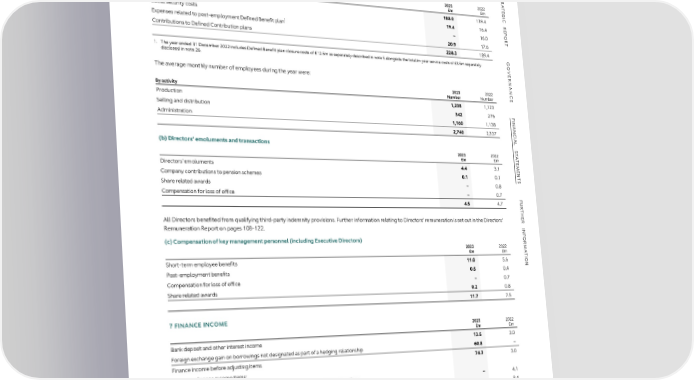 FFIINANNANCCIALIAL S STTAATTEEMMEENNTTSS NOTES TO THE FINANCIAL STATEMENTS CONTINUED S 6 STAFF COSTS AND DIRECTORS’ EMOLUMENTS TR (a) Staff costs (including Directors) A 2023 2022 TE £m £m G I C Wages and salaries 188.0 139.4 R E Social security costs 19.4 16.4 P 1 O Expenses related to post-employment Defined Benefit plan – 16.0 R Contributions to Defined Contribution plans 20.9 17.6 T 228.3 189.4 G 1. The year ended 31 December 2022 includes Defined Benefit plan closure costs of £12.5m as separately described in note 5 alongside the total in-year service costs of £3.5m separately O disclosed in note 26. VE R The average monthly number of employees during the year were: NAN 2023 2022 C By activity Number Number E Production 1,238 1,123 Selling and distribution 342 276 F I Administration 1,160 1,138 NAN 2,740 2,537 C IAL S (b) Directors’ emoluments and transactions T 2023 2022 A £m £m T E M Directors’ emoluments 4.4 3.1 E N Company contributions to pension schemes 0.1 0.1 T Share related awards – 0.8 S Compensation for loss of office – 0.7 F 4.5 4.7 U R T H E All Directors benefited from qualifying third-party indemnity provisions. Further information relating to Directors’ remuneration is set out in the Directors’ R Remuneration Report on pages 108-122. INF (c) Compensation of key management personnel (including Executive Directors) OR 2023 2022 M £m £m A T I Short-term employee benefits 11.0 5.6 ON Post-employment benefits 0.5 0.4 Compensation for loss of office – 0.7 Share related awards 0.2 0.8 11.7 7.5 7 FINANCE INCOME 2023 2022 £m £m Bank deposit and other interest income 13.5 3.0 Foreign exchange gain on borrowings not designated as part of a hedging relationship 60.8 – Finance income before adjusting items 74.3 3.0 Adjusting finance income items: Foreign exchange gain on financial instrument utilised during refinance transactions – 4.1 Gain on financial instruments recognised at fair value through Income Statement (note 23) – 8.4 Total adjusting finance income – 12.5 Total finance income 74.3 15.5 ASTON MARTIN LAGONDA ANNUAL REPORT AND ACCOUNTS 2023 160
