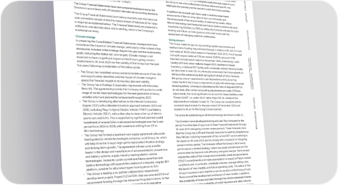 NOTES TO THE FINANCIAL STATEMENTS S S TR 1 BASIS OF ACCOUNTING Climate change considerations have been factored into the Directors’ TR Consolidated Statement of Cash Flows for the year ended 31 December 2023 A Aston Martin Lagonda Global Holdings plc (the “Company”) is a company impairment assessments of the carrying value of non-current assets (such A TE incorporated in England and Wales and domiciled in the UK. The Group as capitalised development cost intangible assets) through usage of a pre- TE 2023 2022 G G I I Notes £m £m C Financial Statements consolidate those of the Company and its tax discount rate which reflects the individual nature and specific risks C Operating activities Rsubsidiaries (together referred to as the “Group”). relating to the business and the market in which the Group operates. R E E P P Loss for the year (226.8) (527.7) OThe Group Financial Statements have been prepared and approved by the In addition the forecast cash flows used in both the impairment O R R Adjustments to reconcile loss for the year to net cash inflow from operating activities TDirectors in accordance with UK adopted international accounting standards. assessments of the carrying value of non-current assets and T Tax (credit)/charge on operations 9 (13.0) 32.7 The Group Financial Statements have been prepared under the historical the assessment of the recoverability of deferred tax assets reflect the current energy cost headwinds and future costs to achieve net-zero Net finance costs 128.6 353.2 Gcost convention except where the measurement of balances at fair value G O manufacturing facilities by 2030 as well as the forecast volumes for both O Depreciation of property, plant and equipment 4 90.3 77.8 VEis required as explained below. The Financial Statements are prepared in existing and future car lines given current order books and the VE Depreciation of right-of-use lease assets 4 9.3 11.0 Rmillions to one decimal place, and in sterling, which is the Company’s assessment of changing customer preferences. R Amortisation of intangible assets 4 283.4 219.3 NANfunctional currency. NAN Going concern Loss on sale/scrap of property, plant and equipment 2.6 – CClimate change C Difference between pension contributions paid and amounts recognised in Income Statement (15.0) (12.1) EIn preparing the Consolidated Financial Statements, management have The Group meets its day-to-day working capital requirements and E considered the impact of climate change, particularly in the context of the medium term funding requirements through a mixture of $1,143.7m First Decrease/(increase) in inventories 11.9 (78.4) Lien notes at 10.5% which mature in November 2025, $121.7m of Second (Increase)/decrease in trade and other receivables (82.3) 0.1 Fdisclosures included in the Strategic Report this year and the sustainability F I Lien split coupon notes at 15% per annum (8.89 % cash and 6.11% I Increase in trade and other payables 50.9 81.5 NANgoals, including the stated net-zero targets. Climate change is not Payment in Kind) which mature in November 2026, a Revolving Credit NAN C expected to have a significant impact on the Group’s going concern Facility (£99.6m) which matures August 2025, facilities to finance C Decrease in advances and customer deposits (66.0) (17.9) IALassessment to 30 June 2025 nor the viability of the Group over the next inventory, a bilateral RCF facility and a wholesale vehicle financing facility IAL Movement in provisions 3.4 0.7 Sfive years following consideration of the below points. (as described in note 18). As previously announced, the Group expects to S Other non-cash movements (0.3) 1.2 T T A refinance the outstanding debt during the first half of 2024, however, A Other non-cash movements – Movements in hedging position and foreign exchange derivatives (7.2) (3.2) T– The Group has modelled various scenarios to take account of the risks T E E M and opportunities identified with the impact of climate change to the going concern assessment is not dependent on this occurring. M Other non-cash movements – Increase in other derivative contracts (11.2) (2.3) E E N assess the financial impact on its business plan and viability. Under the RCF the Group is required to comply with a leverage covenant N Other non-cash movements – Movements in deferred tax relating to RDEC credit 9 (7.4) (3.5) T T Cash generated from operations 151.2 132.4 S– The Group has a Strategic Cooperation Agreement with Mercedes-tested quarterly. Leverage is calculated as the ratio of adjusted EBITDA S Benz AG. The agreement provides the Company with access to a wide to net debt, after certain accounting adjustments are made. Of these Decrease in cash held not available for short-term use 19 0.3 1.5 range of world-class technologies for the next generation of luxury adjustments, the most significant is to account for lease liabilities under F F Income taxes paid 9 (5.6) (6.8) Uvehicles which are planned to be launched through to 2027. “frozen GAAP”, i.e. under IAS17 rather than IFRS 16. Details of this U R R T – The Group is developing alternatives to the Internal Combustion adjustment are included in note 16. The Group has complied with its T Net cash inflow from operating activities 145.9 127.1 H H E Engine (‘ICE’) with a blended drivetrain approach between 2025 and covenant requirements for the year ended 31 December 2023 and E Cash flows from investing activities R R Interest received 7 13.5 2.2 INF2030, including Plug-in Hybrid Electric Vehicle (‘PHEV’) and Battery expects to do so for the Going Concern period. INF Electric Vehicle (‘BEV’), with a clear plan to have a line-up of electric Repayment of loan assets 18 0.5 – ORsports cars and SUVs. This is supported by significant planned capital The amounts outstanding on all the borrowings are shown in note 23. OR Payments to acquire property, plant and equipment (91.1) (58.6) Minvestment of around £2bn in advanced tec