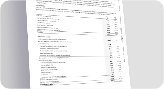 NOTES TO THE FINANCIAL STATEMENTS CONTINUED S S 23 FINANCIAL INSTRUMENTS CONTINUED TR23 FINANCIAL INSTRUMENTS CONTINUED TR Estimation of fair values ACapital management A As at 31 December 2023 As at 31 December 2022 TEThe Board’s policy is to maintain a strong capital base so as to maintain investor and creditor confidence and to sustain the future development of the TE G G Nominal value Book value Fair value Nominal value Book value Fair value I I C business. Given this, the objective of the Group’s capital management is to ensure that it maintains healthy capital ratios in order to support its business and C £m £m £m £m £m £m Rmaximise shareholder value. The capital structure of the Group consists of debt which includes the borrowings disclosed in this note, cash and cash R E E Included in assets P equivalents and equity attributable to equity holders of the parent, comprising share capital and reserves as disclosed in the Consolidated Statement of P O O Level 2 R Changes in Equity. R T T Forward foreign exchange contracts – 3.3 3.3 – 2.3 2.3 Loan assets – – – 0.6 0.6 0.6 24 NET DEBT The Group defines net debt as current and non-current borrowings in addition to inventory repurchase arrangements and lease liabilities, less cash and cash G G Level 3 O equivalents including cash held not available for short-term use. The additional cash flow disclosures required under IAS 7 are made in note 28. O VE VE Investments – 18.2 18.2 – – – 2023 2022 R R Other derivative contracts – – – – 5.6 5.6 £m £m NAN NAN – 21.5 21.5 0.6 8.5 8.5 Cash and cash equivalents 392.4 583.3 C Cash held not available for short-term use – 0.3 C E Inventory repurchase arrangement (39.7) (38.2) E Included in liabilities Level 1 Lease liabilities – current (8.8) (7.4) F F I I $1,143.7m (2022: $1,143.7m) 10.5% US dollar NANLease liabilities – non-current (88.5) (92.4) NAN First Lien Notes 897.2 890.0 906.7 950.8 935.0 893.0 Loans and other borrowings – current (89.4) (107.1) C C $121.7m (2022: $229.1m) 15.0% US dollar IALLoans and other borrowings – non-current (980.3) (1,104.0) IAL S S Second Lien Split Coupon Notes 95.4 90.3 103.6 190.5 169.0 194.4 Net debt (814.3) (765.5) T T A A T T E E Level 2 M Movement in net debt M E E Forward exchange contracts – 2.1 2.1 – 0.7 0.7 N Net (decrease)/increase in cash and cash equivalents (190.9) 164.4 N T T Derivative option over own shares 33.1 23.1 23.1 48.1 22.6 22.6 S Add back cash flows in respect of other components of net debt: S 1,025.7 1,005.5 1,035.5 1,189.4 1,127.3 1,110.7 New borrowings (11.5) – F Proceeds from inventory repurchase arrangement (38.0) (75.7) F U U The nominal value, book value and fair value of the Second Lien SSNs includes $9.8m, $10.5m, $10.8m, $6.8m, $7.0m and $7.2m of PIK notes issued in April 2021, November 2021, April 2022, R R T Repayment of existing borrowings 129.7 172.7 T November 2022, April 2023 and November 2023 respectively. The total number of Second Lien SSNs in issuance has been reduced by repayments of $143.8m and $121.7m in 2022 and 2023 H H respectively. The book value includes accrued PIK notes not issued at each reporting date. ERepayment of inventory repurchase arrangement 40.0 60.0 E R R Under IFRS 7, such assets and liabilities are classified by the way in which their fair value is calculated. The interest-bearing loans and borrowings are INFLease liability payments 7.9 10.0 INF considered to be level 1 liabilities with forward exchange contracts being level 2 assets and liabilities. IFRS 7 defines each level as follows: ORMovement in cash held not available for short-term use (0.3) (1.5) OR M (Increase)/decrease in net debt arising from cash flows (63.1) 329.9 M – Level 1 assets and liabilities have inputs observable through quoted prices. A A T Non-cash movements: T I I – Level 2 assets and liabilities have inputs observable, other than quoted prices, either directly (i.e. as prices) or indirectly (i.e. derived from prices). ONForeign exchange gain/(loss) on secured loan 60.8 (156.2) ON – Level 3 assets and liabilities are those with inputs not based on observable market data. Interest added to debt (14.2) (15.7) Trade and other receivables, current borrowings and trade and other payables are deemed to have the same fair value as their book value and, as such, the Borrowing fee amortisation (26.9) (25.4) table above only includes assets and liabilities held at fair value, and borrowings. The forward currency contracts are carried at fair value based on pricing Lease liability interest charge (4.1) (4.5) models and discounted cash flow techniques derived from assumptions provided by third-party banks. Loan assets are held at cost less any expected credit loss provision (note 18). The SSNs are all valued at amortised cost retranslated at the year-end foreign exchange rate. The fair value of these SSNs at the Lease modifications (0.6) (3.5) current and comparative period ends are determined by reference to the quoted price on The International Stock Exchange Authority in St Peter Port, New leases (5.8) (2.2) Guernsey. The fair value and nominal value exclude the impact of transaction costs. Foreign exchange gain and other movements 5.1 3.7 The other derivative contracts related to one option and one issuable derivative for the Group to acquire a minority shareholding in AMR GP Holdings (Increase)/decrease in net debt (48.8) 126.1 Limited (see note 20). Two derivatives were exercised in the period giving rise to an investment (note 15). Net debt at beginning of the year (765.5) (891.6) The derivative option over own shares reflects the detachable warrants issued alongside the Second Lien SSNs (see borrowings section of note 23) enabling Net debt at the end of the year (814.3) (765.5) the warrant holders to subscribe for a number of ordinary shares in the Company. The fair value is calculated using a binomial model and updated at each period end, reflecting the latest mar
