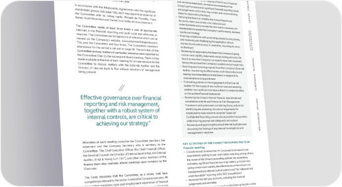S S TR COMMITTEE MEMBERSHIP AND COMMITTEE MEETINGS Key responsibilities of the Committee TR A The Committee currently comprises three Independent A TE Non-executive Directors: Robin Freestone who is Chair of the – Reviewing and assessing the integrity of the Group’s financial TE G G I and narrative statements, formal announcements of the I C Committee, Anne Stevens and Sir Nigel Boardman. The Committee C R therefore meets the requirements of the Code. Group’s performance and significant financial reporting issues R E E P and judgements which they may contain and recommending P O O R In accordance with the Relationship Agreements with the significant these for approval by the Board R T – Advising the Board on whether the Annual Report and T shareholder groups (see page 126), each may appoint an observer of the Committee with no voting rights. Michael de Picciotto, Franz Accounts, taken as a whole is fair, balanced and G Reiner, Scott Robertson and Daniel Li currently serve as observers. understandable and provides the information necessary for G O shareholders to assess the Company’s performance, business O VE The Committee meets at least three times a year at appropriate model and strategy VE R R NAN intervals in the financial reporting and audit cycle and otherwise as – Ensuring compliance with accounting standards and policies, NAN required. The Committee has formal terms of reference which can be and reviewing and challenging the application of such C standards and policies and, if unsatisfied, reporting its views C E viewed on the Company’s website, www.astonmartinlagonda.com. to the Board E This year the Committee met four times. The Committee members’ attendance for the period is set out on page 98. The activities of the – Reviewing for approval by the Board the Company’s going F concern and viability statements and providing advice to the F I Committee and any matters of particular relevance were reported by I NAN the Committee Chair to the subsequent Board meeting. There is time Board on how the Company’s prospects have been assessed, NAN C made available at the end of each meeting for private sessions for the taking into account the Company’s position and principal risks C IAL Committee to discuss matters with the External Auditor and the – Receiving and reviewing reports from the Company’s External IAL S Director of Internal Audit & Risk without members of management Auditor, monitoring its effectiveness and independence and S T T A being present. making recommendations to the Board in respect of its A T T E remuneration and appointment E M M E – Overseeing policies on the engagement of the External E N N T Auditor for the supply of non-audit services and assessing T S S whether non-audit services have a direct or a material effect on the audited financial statements F – Reviewing the Group’s internal financial, operational and F U Effective governance over financial U R compliance controls and Enterprise Risk Management R T T H reporting and risk management, Framework and system and considering Group policies for H E E R R INF identifying and assessing risks and arrangements for INF together with a robust system of employees to raise concerns using the “Speak Up” OR internal controls, are critical to Confidential Reporting process about possible improprieties OR M while ensuring appropriate safeguards are in place M A achieving our strategy.” A T – Reviewing and approving the annual Internal Audit plan and T I I ON discussing the findings of any internal investigations and ON management’s response Attendees at each meeting comprise the Committee members, the observers and the Company Secretary who is secretary to the KEY ACTIVITIES OF THE COMMITTEE DURING THE YEAR Committee. The Chief Executive OfÏcer, the Chief Financial OfÏcer, Financial reporting the General Counsel, the Director of Internal Audit & Risk, the External – Considered and reviewed the UK Corporate Governance Code Auditor, Ernst & Young LLP (“EY”), and other senior members of the requirements relating to year-end matters including, among others, finance team also routinely attend meetings upon invitation by the the review of the Group’s accounting policies, key accounting Chairman. estimates, significant financial reporting matters, principal risks, going concern and viability, the effectiveness of the Group’s risk The Code stipulates that the Committee, as a whole, shall have management and internal control systems and “fair, balanced and competence relevant to the sector in which the Company operates. All understandable” reporting in the 2022 Annual Report Committee members have past employment experience of financial – Reviewed the half year accounts, including the material reporting and/or international business or engineering and collectively judgements and estimates have a broad range of expertise that enables them to provide oversight – Received and considered reports from the External Auditor on the of both financial and risk matters, and to advise the Board accordingly. full year and half year audits As such the Board is satisfied that the Committee, as a whole, has the – Reviewed the Financial Statements, announcements and other competence relevant to the business sector. At least one Committee financial reporting matters including the approval of the interim member should have recent and relevant financial experience and results announcement, trading updates and the review of the 2022 Robin Freestone meets this requirement having previously held the Annual Report position of Chief Financial OfÏcer of Pearson plc and as a qualified – Considered the correspondence from the FRC which raised a chartered accountant. Details of the Committee members’ experience number of questions relating to the Company’s 2022 Annual can be found in their biographies on pages 77-79. Report and reviewed management’s responses ASTON MARTIN LAGONDA ANN