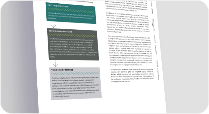 GOVERNANCE AUDIT AND RISK COMMITTEE REPORT CONTINUED S The Group uses a three lines of defence assurance model with the Internal Audit TR objective of embedding effective risk management and control The Internal Audit & Risk Management function provides independent, A throughout the business and providing assurance to the Board and the objective assurance and advice to the Board, the Committee and TE G I Committee of the effectiveness of internal controls and risk senior management on whether the existing control and governance C management across the organisation. This comprises the following: R frameworks are operating effectively to meet the Group’s strategic E objectives and to help the Company identify and mitigate any potential P O control weaknesses and identify any emerging risks. R FIRST LINE OF DEFENCE T The Director of Internal Audit & Risk reports to the Chief Financial OfÏcer with an independent reporting line to the Committee Chair. G Functional management who are responsible for embedding risk The Director provides regular reports to the Committee on the O management and internal control systems into their business VE function’s activities, which detail significant audit findings, progress of, R processes. and any changes to, the Internal Audit plan and updates on agreed NAN management actions to rectify control weaknesses. Where C appropriate, the Director will provide a deep dive into an issue where E – either the Committee has requested more information or the Director considers it pertinent. F SECOND LINE OF DEFENCE I NAN The Committee assesses the effectiveness of the Internal Audit & Risk Management function on an annual basis. To ensure that it is meeting C Functions which oversee or specialise in risk management and its objectives, the Internal Audit & Risk Management function has an IAL compliance-related activity. They monitor and facilitate the annual work plan comprising risk-based cyclical audits, reviews of risk S T implementation of effective risk management and control mitigation plans and assessments of emerging risks and business A T activities by the first line. These functions include Financial change activity, together with work mandated for compliance E M Internal Control, Quality Audit, Security, IT, Health and Safety, purposes. At the November 2023 Committee meeting the Internal E N Environmental, Corporate Compliance and the risk management Audit plan for 2024 was approved by the Committee and the T activities performed by the Internal Audit & Risk Management Committee will monitor progress against the plan in the coming year, S team. as well as whether the plan remains focused on the evolving key risks F facing the business. Such reviews will consider any changes to risk U R registers, current hot topics and emerging risks in the industry as well T H as changes based on engagement with the business. E – R INF THIRD LINE OF DEFENCE During the year, 16 internal audits were carried out including human resource core activities, gifts and hospitality policy adherence, OR finished vehicle inventory and sales logistics procedures and key M A financial controls in Aston Martin Lagonda China. The conclusions of T Functions which provide independent objective assurance to the I Board, Audit and Risk Committee and senior management the audits were discussed by the Committee and remediation actions ON were agreed where required. regarding the effectiveness of the first and second lines of defence. This includes Internal Audit & Risk Management and the External Auditor and other external providers of assurance including those which provide assurance over dealer adherence to operating standards and assurance over data within our Sustainability Report. ASTON MARTIN LAGONDA ANNUAL REPORT AND ACCOUNTS 2023 104