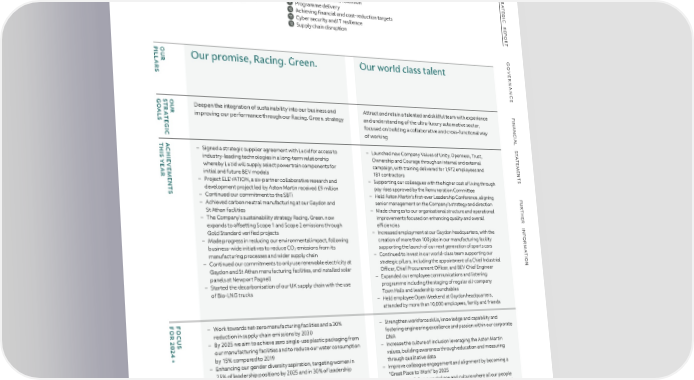 OUR KEY PERFORMANCE INDICATORS PRINCIPAL RISKS AND UNCERTAINTIES 1 Revenue 1 Macroeconomic and political instability 2 Wholesale volumes 2 Brand/reputational damage 3 Operating profit 3 Technological advancement 4 Adjusted EBITDA 4 Climate change S 5 5 Liquidity S TR Net Debt TR 6 Net Debt to adjusted EBITDA 6 Impairment of capitalised development costs A A TE 7 Free cash flow 7 Compliance with laws and regulations TE G 8 Quality 8 Talent acquisition and retention G I I C C R 9 Health & Safety Accident Frequency Rate 9 Programme delivery R E 10 E Achieving financial and cost-reduction targets P P O 11 Cyber security and IT resilience O R 12 R T Supply chain disruption T G G O O VE P O VE I U R LL R Our promise, Racing. Green. Our world class talent R NAN A NAN R S C C E E F G S O F I OA TR U Deepen the integration of sustainability into our business and Attract and retain a talented and skillful team with experience I NAN A R NAN L TE improving our performance through our Racing. Green. strategy and understanding of the ultra-luxury automotive sector, C S focused on building a collaborative and cross-functional way C IAL G IAL I S C of working S T T A T A H C – Signed a strategic supplier agreement with Lucid for access to – Launched new Company Values of Unity, Openness, Trust, A T I H T E S YI industry-leading technologies in a long-term relationship Ownership and Courage through an internal and external E M EV M E E whereby Lucid will supply select powertrain components for campaign, with training delivered for 1,972 employees and E N A E N T R M initial and future BEV models 181 contractors T S EN – Project ELEVATION, a six-partner collaborative research and – Supporting our colleagues with the higher cost of living through S T development project led by Aston Martin received £9 million pay rises approved by the Remuneration Committee S – Continued our commitment to the SBTi – Held Aston Martin’s first-ever Leadership Conference, aligning F F U – Achieved carbon neutral manufacturing at our Gaydon and senior management on the Company’s strategy and direction U R R T St Athan facilities – Made changes to our organisational structure and operational T H H E – The Company’s sustainability strategy Racing. Green. now improvements focused on enhancing quality and overall E R R INF expands to offsetting Scope 1 and Scope 2 emissions through efÏciencies INF Gold Standard verified projects – Increased employment at our Gaydon headquarters, with the OR – Made progress in reducing our environmental impact, following creation of more than 100 jobs in our manufacturing facility OR M business-wide initiatives to reduce CO emissions from its supporting the launch of our next generation of sports cars M 2 A A T manufacturing processes and wider supply chain – Continued to invest in our world-class team supporting our T I I ON – Continued our commitments to only use renewable electricity at strategic pillars, including the appointment of a Chief Industrial ON Gaydon and St Athan manufacturing facilities, and installed solar OfÏcer, Chief Procurement OfÏcer, and BEV Chief Engineer panels at Newport Pagnell – Expanded our employee communications and listening – Started the decarbonisation of our UK supply chain with the use programme including the staging of regular all-company of Bio-LNG trucks Town Halls and leadership roundtables – Held employee Open Weekend at Gaydon headquarters, attended by more than 10,000 employees, family and friends F F O O – Work towards net-zero manufacturing facilities and a 30% – Strengthen workforce skills, knowledge and capability and R 2C U reduction in supply chain emissions by 2030 fostering engineering excellence and passion within our corporate 0 S – By 2025 we aim to achieve zero single-use plastic packaging from DNA 2 4 + our manufacturing facilities and to reduce our water consumption – Increase the culture of inclusion leveraging the Aston Martin by 15% compared to 2019 values, building awareness through education and measuring – Enhancing our gender diversity aspiration, targeting women in through qualitative data 25% of leadership positions by 2025 and in 30% of leadership – Improve colleague engagement and alignment by becoming a positions by 2030 “Great Place to Work” by 2025 – Improving biodiversity at our manufacturing facilities – Continue building a workplace and culture where all our people feel connected to Aston Martin’s purpose, where they have a voice and can develop to reach their full potential LINK TO KPIS: 3 4 8 9 LINK TO KPIS: 8 9 LINK TO RISKS: 1 3 4 7 9 10 11 12 LINK TO RISKS: 5 8 9 10 11 ASTON MARTIN LAGONDA ANNUAL REPORT AND ACCOUNTS 2023 33