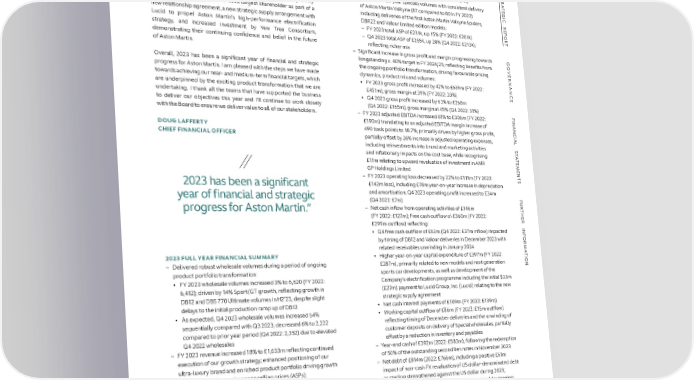 STRATEGIC REPORT FINANCIAL REVIEW S Through continuous engagement with our stakeholders during the – FY 2023 core ASP of £188k, up 6% (FY 2022: £177k) TR year, I was pleased to see the development of both new and existing – Q4 2023 core ASP of £196k, up 7% (Q4 2022: £184k) A strategic relationships as we progress to deliver long-term value to all • Higher year-on-year Specials volumes with consistent delivery TE G I of our shareholders. This included increased investment by Geely of Aston Martin Valkyrie (87 compared to 80 in FY 2022) C Holding Group to become our third largest shareholder as part of a R including deliveries of the first Aston Martin Valkyrie Spiders, E new relationship agreement, a new strategic supply arrangement with DBR22 and Valour limited edition models: P O Lucid to propel Aston Martin’s high-performance electrification – FY 2023 total ASP of £231k, up 15% (FY 2022: £201k) R strategy, and increased investment by Yew Tree Consortium, – Q4 2023 total ASP of £255k, up 20% (Q4 2022: £213k); T demonstrating their continuing confidence and belief in the future reflecting richer mix of Aston Martin. – Significant increase in gross profit and margin progressing towards G O longstanding c. 40% target in FY 2024/25; reflecting benefits from VE Overall, 2023 has been a significant year of financial and strategic the ongoing portfolio transformation, driving favourable pricing R progress for Aston Martin. I am pleased with the steps we have made dynamics, product mix and volumes: NAN towards achieving our near- and medium-term financial targets, which • FY 2023 gross profit increased by 42% to £639m (FY 2022: C are underpinned by the exciting product transformation that we are £451m); gross margin at 39% (FY 2022: 33%) E undertaking. I thank all the teams that have supported the business • Q4 2023 gross profit increased by 63% to £268m to deliver our objectives this year and I’ll continue to work closely (Q4 2022: £165m); gross margin at 45% (Q4 2022: 31%) F with the Board to ensure we deliver value to all of our stakeholders. – FY 2023 adjusted EBITDA increased 61% to £306m (FY 2022: I NAN £190m) translating to an adjusted EBITDA margin increase of DOUG LAFFERTY 490 basis points to 18.7%; primarily driven by higher gross profit, C CHIEF FINANCIAL OFFICER IAL partially offset by 26% increase in adjusted operating expenses, including reinvestments into brand and marketing activities S T and inflationary impacts on the cost base, while recognising A T £11m relating to upward revaluation of investment in AMR E M GP Holdings Limited E N – FY 2023 operating loss decreased by 22% to £111m (FY 2022: T S £142m loss), including £78m year-on-year increase in depreciation 2023 has been a significant and amortisation; Q4 2023 operating profit increased to £34m year of financial and strategic F (Q4 2022: £7m) U R progress for Aston Martin.” – Net cash inflow from operating activities of £146m T H (FY 2022: £127m); Free cash outflow of £360m (FY 2022: E R £299m outflow) reflecting: INF • Q4 free cash outflow of £63m (Q4 2022: £37m inflow) impacted by timing of DB12 and Valour deliveries in December 2023 with OR related receivables unwinding in January 2024 M A 2023 FULL YEAR FINANCIAL SUMMARY • Higher year-on-year capital expenditure of £397m (FY 2022: T I – Delivered robust wholesale volumes during a period of ongoing ON £287m), primarily related to new models and next generation product portfolio transformation: sports car developments, as well as development of the • FY 2023 wholesale volumes increased 3% to 6,620 (FY 2022: Company’s electrification programme including the initial $33m 6,412); driven by 14% Sport/GT growth, reflecting growth in (£27m) payment to Lucid Group, Inc. (Lucid) relating to the new DB12 and DBS 770 Ultimate volumes in H2’23, despite slight strategic supply agreement delays to the initial production ramp up of DB12 • Net cash interest payments of £109m (FY 2022: £139m) • As expected, Q4 2023 wholesale volumes increased 54% • Working capital outflow of £86m (FY 2022: £15m outflow) sequentially compared with Q3 2023; decreased 6% to 2,222 reflecting timing of December deliveries and the unwinding of compared to prior year period (Q4 2022: 2,352) due to elevated customer deposits on delivery of Special wholesales, partially Q4 2022 wholesales offset by a reduction in inventory and payables – FY 2023 revenue increased 18% to £1,633m reflecting continued – Year-end cash of £392m (2022: £583m), following the redemption execution of our growth strategy; enhanced positioning of our of 50% of the outstanding second lien notes in November 2023 ultra-luxury brand and enriched product portfolio driving growth – Net debt of £814m (2022: £766m), including a positive £61m in volumes and record average selling prices (ASPs): impact of non-cash FX revaluation of US dollar-denominated debt • Strong pricing dynamics in the core portfolio and favourable as sterling strengthened against the US dollar during 2023; mix from DBS 770 Ultimate, DBX707, V12 Vantage Roadster disciplined strategic delivery supported ongoing deleveraging and new DB12: with net leverage ratio improving to 2.7x (2022: 4.0x) ASTON MARTIN LAGONDA ANNUAL REPORT AND ACCOUNTS 2023 38