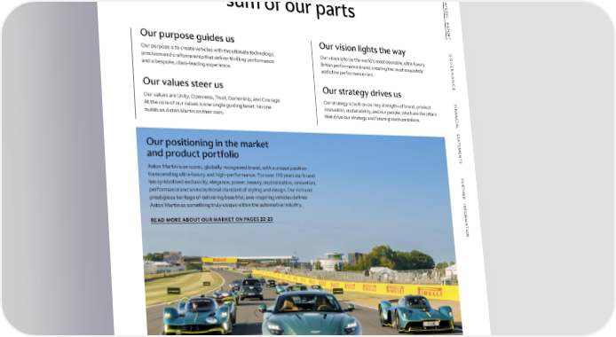 STRATEGIC REPORT AT A GLANCE S S TR TR A A TE Stronger than the TE G G I I C C R R E sum of our parts E P P O O R R T T G G O Our purpose guides us Our vision lights the way O VE Our purpose is to create vehicles with the ultimate technology, Our vision is to be the world’s most desirable, ultra-luxury VE R R NAN precision and craftsmanship that deliver thrilling performance British performance brand, creating the most exquisitely NAN and a bespoke, class-leading experience. addictive performance cars. C C E E Our values steer us Our strategy drives us F F I I NAN Our values are Unity, Openness, Trust, Ownership, and Courage. Our strategy is built on our key strengths of brand, product NAN At the core of our values is one single guiding tenet: No one innovation, sustainability, and our people, which are the pillars C C IAL builds an Aston Martin on their own. that drive our strategy and future growth ambitions. IAL S S T T A A T T E E M M E Our positioning in the market E N N T T S and product portfolio S Aston Martin is an iconic, globally recognised brand, with a unique position F transcending ultra-luxury and high-performance. For over 110 years our brand F U U R has symbolised exclusivity, elegance, power, beauty, sophistication, innovation, R T T H performance and an exceptional standard of styling and design. Our rich and H E E R prestigious heritage of delivering beautiful, awe-inspiring vehicles defines R INF INF Aston Martin as something truly unique within the automotive industry. OR OR M READ MORE ABOUT OUR MARKET ON PAGES 22-23 M A A T T I I ON ON ASTON MARTIN LAGONDA ANNUAL REPORT AND ACCOUNTS 2023 12