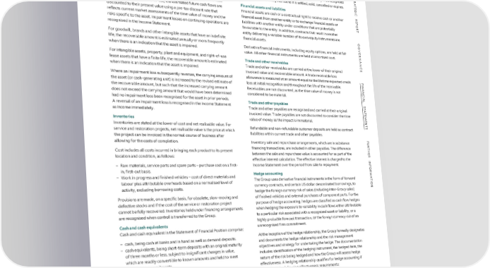 FFIINANNANCCIALIAL S STTAATTEEMMEENNTTSS NOTES TO THE FINANCIAL STATEMENTS CONTINUED S 2 ACCOUNTING POLICIES CONTINUED designated as hedging instruments in hedging relationships is detailed in TR Impairment of assets continued the hedge accounting policies. A financial asset or liability is derecognised A Where the carrying amount of an asset exceeds its recoverable amount, when the contract that gives rise to it is settled, sold, cancelled or expires. TE G I the asset is considered impaired and is written down to its recoverable C amount. In assessing value-in-use, the estimated future cash flows are Financial assets and liabilities R Financial assets are cash or a contractual right to receive cash or another E discounted to their present value using a pre-tax discount rate that P financial asset from another entity or to exchange financial assets or O reflects current market assessments of the time value of money and the R risks specific to the asset. Impairment losses on continuing operations are liabilities with another entity under conditions that are potentially T recognised in the Income Statement. favourable to the entity. In addition, contracts that result in another entity delivering a variable number of its own equity instruments are G For goodwill, brands and other intangible assets that have an indefinite financial assets. O life, the recoverable amount is estimated annually or more frequently VE when there is an indication that the asset is impaired. Derivative financial instruments, including equity options, are held at fair R value. All other financial instruments are held at amortised cost. NAN For intangible assets, property, plant and equipment, and right-of-use Trade and other receivables C lease assets that have a finite life, the recoverable amount is estimated Trade and other receivables are carried at the lower of their original E when there is an indication that the asset is impaired. invoiced value and recoverable amount. A trade receivable loss Where an impairment loss subsequently reverses, the carrying amount of allowance is measured at an amount equal to the lifetime expected credit F I the asset (or cash-generating unit) is increased to the revised estimate of loss at initial recognition and throughout the life of the receivable. NAN the recoverable amount, but such that the increased carrying amount Receivables are not discounted, as the time value of money is not C does not exceed the carrying amount that would have been determined considered to be material. IAL had no impairment loss been recognised for the asset in prior periods. Trade and other payables S A reversal of an impairment loss is recognised in the Income Statement T A Trade and other payables are recognised and carried at their original T as income immediately. E invoiced value. Trade payables are not discounted to consider the time M E Inventories value of money as the impact is immaterial. N T Inventories are stated at the lower of cost and net realisable value. For Refundable and non-refundable customer deposits are held as contract S service and restoration projects, net realisable value is the price at which liabilities within current trade and other payables. the project can be invoiced in the normal course of business after F allowing for the costs of completion. Inventory sale and repurchase arrangements, which are in substance U R financing transactions, are included in other payables. The difference T Cost includes all costs incurred in bringing each product to its present H between the sale and repurchase value is accounted for as part of the E location and condition, as follows: R effective interest calculation. The effective interest is charged to the INF – Raw materials, service parts and spare parts – purchase cost on a first- Income Statement over the period from sale to repayment. in, first-out basis. OR Hedge accounting M – Work in progress and finished vehicles – cost of direct materials and A The Group uses derivative financial instruments in the form of forward T labour plus attributable overheads based on a normalised level of I activity, excluding borrowing costs. currency contracts, and certain US dollar denominated borrowings, to ON hedge the foreign currency risk of sales (including inter-Group sales) Provisions are made, on a specific basis, for obsolete, slow-moving and of finished vehicles and external purchases of component parts. For the defective stocks and if the cost of the service or restoration project purpose of hedge accounting, hedges are classified as cash flow hedges cannot be fully recovered. Inventories held under financing arrangements when hedging the exposure to variability in cash flows either attributable are recognised when control is transferred to the Group. to a particular risk associated with a recognised asset or liability, or a Cash and cash equivalents highly probable forecast transaction, or the foreign currency risk of an Cash and cash equivalent in the Statement of Financial Position comprise: unrecognised firm commitment. – cash, being cash at banks and in hand as well as demand deposits. At the inception of the hedge relationship, the Group formally designates – cash equivalents, being short-term deposits with an original maturity and documents the hedge relationship and the risk management of three months or less, subject to insignificant changes in value, objectives and strategy for undertaking the hedge. The documentation which are readily convertible to known amounts and held to meet includes identification of the hedging instrument, the hedged item, the short-term commitments. nature of the risk being hedged and how the Group will assess hedge effectiveness. A hedging relationship qualifies for hedge accounting if Derivative financial instruments it meets all the following effectiveness requirements: Derivative financial assets and liabilities are recognised in the Statement – There is an economic relationship be