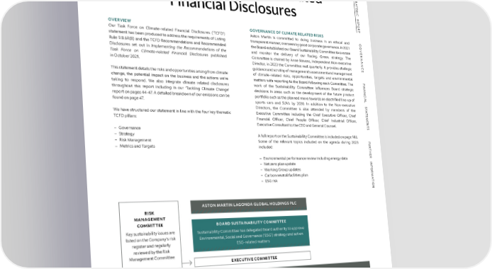 STRATEGIC REPORT TASK FORCE ON CLIMATE-RELATED FINANCIAL DISCLOSURES S TR A Task Force on Climate-Related TE G I C R Financial Disclosures E P O R T OVERVIEW GOVERNANCE OF CLIMATE RELATED RISKS Our Task Force on Climate-related Financial Disclosures (‘TCFD’) Aston Martin is committed to doing business in an ethical and G statement has been produced to address the requirements of Listing transparent manner, overseen by good corporate governance. In 2021 O VE Rule 9.8.6R(8) and the TCFD Recommendations and Recommended the Board established our Board Sustainability Committee to oversee R Disclosures set out in Implementing the Recommendations of the and monitor the delivery of our Racing. Green. strategy. The NAN Task Force on Climate-related Financial Disclosures published Committee is chaired by Anne Stevens, Independent Non-executive C in October 2021. Director, in 2023 the Committee met quarterly. It provides strategic E guidance and scrutiny of management’s assessment and management This statement details the risks and opportunities arising from climate of climate-related risks, opportunities, targets and environmental F change, the potential impact on the business and the actions we’re matters with reporting to the Board following each Committee. The I taking to respond. We also integrate climate related disclosures NAN work of the Sustainability Committee influences Board strategic throughout this report including in our ‘Tackling Climate Change’ decisions in areas such as the development of the future product C report on pages 44-47. A detailed breakdown of our emissions can be IAL portfolio such as the planned move towards an electrified line-up of found on page 47. sports cars and SUVs by 2030. In addition to the Non-executive S T Directors, the Committee is also attended by members of the A T We have structured our statement in line with the four key thematic Executive Committee including the Chief Executive OfÏcer, Chief E M TCFD pillars: Financial OfÏcer, Chief People OfÏcer, Chief Industrial OfÏcer, E N Executive Consultant to the CEO and General Counsel. T – Governance S – Strategy A full report on the Sustainability Committee is included on page 106. F – Risk Management Some of the relevant topics included on the agenda during 2023 U R – Metrics and Targets included: T H E R – Environmental performance review including energy data INF – Net zero plan update – Working Group updates OR – Carbon neutral facilities plan M A – ESG risk T I ON ASTON MARTIN LAGONDA GLOBAL HOLDINGS PLC RISK MANAGEMENT COMMITTEE BOARD SUSTAINABILITY COMMITTEE Key sustainability issues are Sustainability Committee has delegated Board authority to approve listed on the Company’s risk Environmental, Social and Governance (‘ESG’) strategy and act on register and regularly ESG-related matters reviewed by the Risk Management Committee EXECUTIVE COMMITTEE WORKING GROUPS ENERGY AND WATER MODERN SLAVERY ENVIRONMENT WASTE ELECTRIC VEHICLES SUSTAINABLE SUSTAINABILITY DIVERSITY AND HEALTH AND SAFETY DESIGN AND SUPPLY CHAIN COMMUNICATIONS INCLUSION (ISO 45001) SUSTAINABILITY INNOVATION ASTON MARTIN LAGONDA ANNUAL REPORT AND ACCOUNTS 2023 58