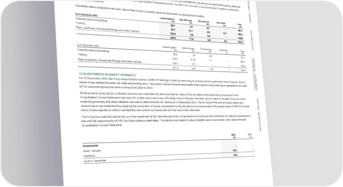 FFIINANNANCCIALIAL S STTAATTEEMMEENNTTSS NOTES TO THE FINANCIAL STATEMENTS CONTINUED S 14 PROPERTY, PLANT AND EQUIPMENT CONTINUED TR Property, plant and equipment provides security for a fixed and floating charge in favour of the Aston Martin Lagonda Limited pension scheme. A TE Assets in the course of construction at a cost of £37.4m (2022: £32.9m) are not depreciated until available for use and are included within tooling, plant and G I C machinery. The gross value of freehold land and buildings includes freehold land of £6.1m (2022: £6.1m) which is not depreciated. Capital commitments R are disclosed in note 30. E P O The tables below analyse the net book value of the Group’s property, plant and equipment by geographical location. R T United Kingdom Rest of Europe The Americas Asia Pacific Total At 31 December 2023 £m £m £m £m £m Freehold land and buildings 38.7 1.9 5.7 – 46.3 G O Tooling 83.7 73.7 0.9 0.3 158.6 VE Plant, machinery, fixtures and fittings, and motor vehicles 146.6 2.0 0.2 – 148.8 R 269.0 77.6 6.8 0.3 353.7 NAN C United Kingdom Rest of Europe The Americas Asia Pacific Total E At 31 December 2022 £m £m £m £m £m F Freehold land and buildings 36.6 1.8 2.9 – 41.3 I NAN Tooling 120.3 61.8 1.1 – 183.2 Plant, machinery, fixtures and fittings, and motor vehicles 144.7 0.7 – – 145.4 C IAL 301.6 64.3 4.0 – 369.9 S T A 15 INVESTMENTS IN EQUITY INTERESTS T E On 15 November 2023, the Group subscribed for shares in AMR GP Holdings Limited by exercising its primary warrant option and subscribing for reward M E shares it was entitled to under the initial sponsorship term. The primary warrant became exercisable following the Group entering an agreement with AMR N T GP for a second sponsorship term running from 2026 to 2030. S At the point of subscription, a valuation exercise was undertaken to determine the fair value of the derivatives with a gain being recognised in the F Consolidated Income Statement (see note 20). As the subscription was sufficiently close to the year-end date, and no material changes have occurred in U R underlying business, the same valuation was used to determine the fair value as at 31 December 2023. The fair value of the warrant equity option and T H reward shares was established by applying the proportion of equity represented by the derivatives to an assessment of the equity value of AMR GP Limited, E R which is then adjusted to reflect marketability and control commensurate with the size of the investment. INF The Group has made the election to carry the investment at fair value through other comprehensive income and will continue to fair value the investment in OR line with the requirements of IFRS 9 at future balance sheet dates. This election was made to reduce volatility due to movements in fair value within the M Consolidated Income Statement. A T I ON 2023 2022 £m £m Investments As at 1 January – – Additions 18.2 – As at 31 December 18.2 – ASTON MARTIN LAGONDA ANNUAL REPORT AND ACCOUNTS 2023 168