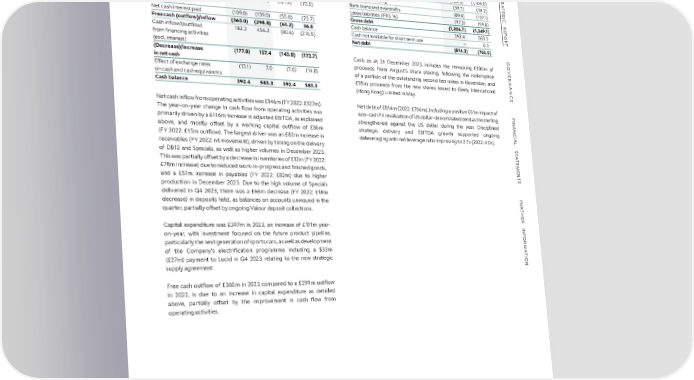 S S TR Cash flow and net debt £m 31-Dec-23 31-Dec-22 TR £m FY 2023 FY 2022 Q4 2023 Q4 2022 A Loan notes (980.3) (1,104.0) A TE Cash generated from 145.9 127.1 114.5 184.0 TE G Inventory financing (39.7) (38.2) G I operating activities I C Bank loans and overdrafts (89.4) (107.1) C R Cash used in investing activities (396.9) (286.9) (121.9) (73.5) R Lease liabilities (IFRS 16) (97.3) (99.8) E (excl. interest) E P Gross debt (1,206.7) (1,349.1) P O Net cash interest paid (109.0) (139.0) (55.8) (73.7) O R Cash balance 392.4 583.3 R T Free cash (outflow)/inflow (360.0) (298.8) (63.2) 36.8 Cash not available for short term use – 0.3 T Cash inflow/(outflow) 182.2 456.2 (80.6) (210.5) Net debt (814.3) (765.5) from financing activities G (excl. interest) G O O VE (Decrease)/increase (177.8) 157.4 (143.8) (173.7) Cash as at 31 December 2023 includes the remaining £106m of VE R in net cash proceeds from August’s share placing, following the redemption R NAN Effect of exchange rates (13.1) 7.0 (7.6) (14.8) of a portion of the outstanding second lien notes in November, and NAN on cash and cash equivalents £95m proceeds from the new shares issued to Geely International C Cash balance 392.4 583.3 392.4 583.3 C E (Hong Kong) Limited in May. E Net cash inflow from operating activities was £146m (FY 2022: £127m). Net debt of £814m (2022: £766m), including a positive £61m impact of F F I I NAN The year-on-year change in cash flow from operating activities was non-cash FX revaluation of US dollar-denominated debt as the sterling NAN primarily driven by a £116m increase in adjusted EBITDA, as explained strengthened against the US dollar during the year. Disciplined C above, and mostly offset by a working capital outflow of £86m C IAL strategic delivery and EBITDA growth supported ongoing IAL (FY 2022: £15m outflow). The largest driver was an £82m increase in S deleveraging with net leverage ratio improving to 2.7x (2022: 4.0x). S receivables (FY 2022: nil movement), driven by timing on the delivery T T A of DB12 and Specials, as well as higher volumes in December 2023. A T T E E M This was partially offset by a decrease in inventories of £12m (FY 2022: M E E N £78m increase) due to reduced work-in-progress and finished goods, N T T S and a £51m increase in payables (FY 2022: £82m) due to higher S production in December 2023. Due to the high volume of Specials delivered in Q4 2023, there was a £66m decrease (FY 2022: £18m F F U decrease) in deposits held, as balances on accounts unwound in the U R R T quarter, partially offset by ongoing Valour deposit collections. T H H E E R R INF Capital expenditure was £397m in 2023, an increase of £111m year- INF on-year, with investment focused on the future product pipeline, OR particularly the next generation of sports cars, as well as development OR M of the Company’s electrification programme including a $33m M A A T T I (£27m) payment to Lucid in Q4 2023 relating to the new strategic I ON ON supply agreement. Free cash outflow of £360m in 2023 compared to a £299m outflow in 2022, is due to an increase in capital expenditure as detailed above, partially offset by the improvement in cash flow from operating activities. ASTON MARTIN LAGONDA ANNUAL REPORT AND ACCOUNTS 2023 41