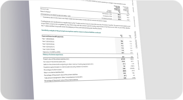 FFIINANNANCCIALIAL S STTAATTEEMMEENNTTSS NOTES TO THE FINANCIAL STATEMENTS CONTINUED S 26 PENSION OBLIGATIONS CONTINUED TR A TE Sensitivity analysis of the principal assumptions used to measure scheme liabilities G I At 31 December 2023 the present value of the benefit obligation was £215.9m (2022: £189.0m) and its sensitivity to changes in key assumptions were: C R Present value Present value E of benefit of benefit P obligations at obligations at O R 31 December 31 December T Change in 2023 2022 assumption £m £m Discount rate Decrease by 1.00% 260.3 228.7 G Rate of inflation* Increase by 0.25% 222.5 196.7 O Life expectancy increased by approximately 1 year Increase by one year 223.2 194.7 VE R * This sensitivity allows for the impact on all inflation-related assumptions (salary increases, deferred revaluation and pension increases). NAN C Funding levels are monitored on a regular basis by the Trustee and the Group to ensure the security of members’ benefits. The next triennial valuation, as at E 6 April 2023, is due to be completed by July 2024 in line with the scheme-specific funding requirements of the Pensions Act 2004. As part of that valuation the Trustee and the Group will review the adequacy of the contributions being paid into the scheme. F I NAN Sensitivity analysis of the principal assumptions used to measure scheme liabilities continued C 2023 2022 IAL £m £m Expected future benefit payments S T Year 1 (2023/2024) 10.6 11.2 A T E Year 2 (2024/2025) 10.9 11.6 M E Year 3 (2025/2026) 11.2 11.9 N T Year 4 (2026/2027) 11.6 12.3 S Year 5 (2027/2028) 11.9 12.6 Years 6 to 10 (2029 to 2033) 63.7 67.9 F U R History of scheme experience T H 2023 2022 E R Present value of the scheme liabilities (£m) (215.9) (188.9) INF Fair value of the scheme assets (£m) 212.8 187.0 Deficit in the scheme before adjusting to reflect minimum funding requirements (£m) (3.1) (1.9) OR M Experience gains/(losses) on scheme assets excluding interest income (£m) 5.6 (188.5) A T I Percentage of scheme assets 2.6% (100.8%) ON Return on scheme liabilities (£m) (20.4) (14.7) Percentage of the present value of the scheme liabilities 9.4% 7.8% Total amount recognised in Other Comprehensive Income (£m) (0.1) 6.8 Percentage of the present value of the scheme liabilities 0.0% (3.6%) ASTON MARTIN LAGONDA ANNUAL REPORT AND ACCOUNTS 2023 190
