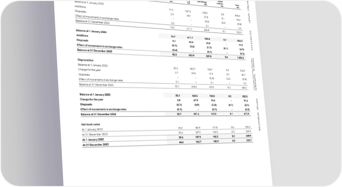NOTES TO THE FINANCIAL STATEMENTS CONTINUED S S 13 IMPAIRMENT TESTING TR14 PROPERTY, PLANT AND EQUIPMENT TR Indefinite useful life non-current assets A Freehold Plant, machinery, A Goodwill and brands acquired through business combinations have been allocated for impairment testing purposes to one cash-generating unit – the Aston TEland and fixtures Motor TE G buildings Tooling and fittings vehicles Total G I £m £m £m £m £m I Martin Lagonda Group business. This represents the lowest level within the Group at which goodwill and brands are monitored for internal purposes. C C R R The Group has considered the carrying value of its assets in the context of the Group’s market capitalisation. At this level, it was concluded that the net Cost E E assets of the Group are recoverable owing to the Group’s market capitalisation of £1.9bn at 31 December 2023. PBalance at 1 January 2022 71.5 547.6 238.5 0.8 858.4 P O O R R T T Finite useful life non-current assets Additions 2.9 64.1 27.8 0.1 94.9 Recoverability of non-current assets with finite useful lives include property, plant and equipment, right-of-use lease assets and certain intangible assets. Disposals – – (0.6) (0.2) (0.8) Intangible assets with finite useful lives mainly consist of capitalised development costs and technology. Effect of movements in exchange rates 0.3 – 0.1 – 0.4 G G O Balance at 31 December 2022 74.7 611.7 265.8 0.7 952.9 O The Group reviews the carrying amount of non-current assets with finite useful lives when events and circumstances indicate that an asset may be impaired. VE VE Impairment tests are performed by comparing the carrying amount and the recoverable amount of the assets. The recoverable amount is the higher of the R R assets’ fair value less costs of disposal and its value-in-use. Where non-current assets with finite useful lives are not yet available for use, these are tested for NANBalance at 1 January 2023 74.7 611.7 265.8 0.7 952.9 NAN impairment annually. Additions 9.1 45.0 23.8 - 77.9 C C E E In assessing the value-in-use, the estimated future cash flows relating to the forecast usage period of the asset, or group of assets, are discounted to their Disposals (0.1) (2.8) (1.7) (0.1) (4.7) present value using a pre-tax discount rate that reflects current market assessments of the time value of money and the risks. Effect of movements in exchange rates (0.4) – (0.1) – (0.5) F Balance at 31 December 2023 83.3 653.9 287.8 0.6 1,025.6 F I I Key assumptions used in value-in-use calculations NAN NAN Where there are indicators of impairment, the calculation of value-in-use for the assets is most sensitive to the following assumptions: C C Depreciation – Cash flows are projected based on actual operating results and the current five-year plan. IAL IAL – Discount rates are calculated using a weighted average cost of capital approach. They reflect the individual nature and specific risks relating to the SBalance at 1 January 2022 32.3 363.7 106.7 0.2 502.9 S T T Charge for the year 2.7 60.5 17.3 0.2 80.7 business and the market in which the Group operates. The pre-tax discount rate used was 14.0% (2022: 14.0%). A A T T Disposals – – (0.6) (0.2) (0.8) – A long-term growth rate of 2% (2022: 2%) E E M M E Effect of movements in exchange rates 0.1 – 0.1 – 0.2 E Sensitivity analysis N N T Balance at 31 December 2022 35.1 424.2 123.5 0.2 583.0 T – As at 31 December 2023, the gross margin would need to decrease by 36% before any of the finite life assets become impaired. S S The Group has considered the carrying value of its assets in conjunction with the trading and cash flow forecasts for the Group including factors related Balance at 1 January 2023 35.1 424.2 123.5 0.2 583.0 to the Group’s ongoing climate commitments (see note 1). The Group is satisfied no impairment is required at 31 December 2023. No reasonably possible F F U U Charge for the year 3.8 67.9 19.5 – 91.2 change in an assumption could result in a material impact on the impairment assessment in the next twelve months. R R T T H H Disposals (0.1) (0.9) (1.0) (0.1) (2.1) E E R R INF Effect of movements in exchange rates (0.1) – (0.1) – (0.2) INF Balance at 31 December 2032 38.7 491.2 141.9 0.1 671.9 OR OR M M A A Net book value T T I I ON ON At 1 January 2022 39.2 183.9 131.8 0.6 355.5 At 31 December 2022 39.6 187.5 142.3 0.5 369.9 At 1 January 2023 39.6 187.5 142.3 0.5 369.9 At 31 December 2023 44.6 162.7 145.9 0.5 353.7 ASTON MARTIN LAGONDA ANNUAL REPORT AND ACCOUNTS 2023 167
