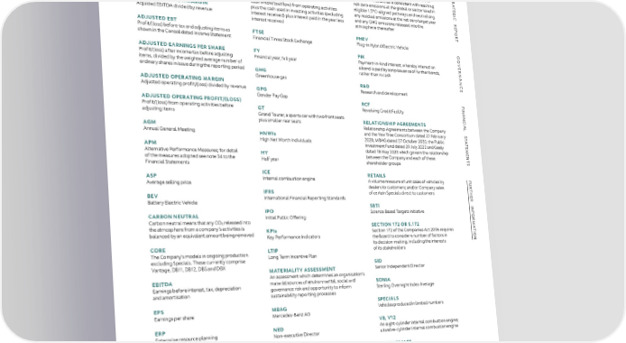 FURTHER INFORMATION GLOSSARY S S TR ADJUSTED EBITDA FRC NET-ZERO TR A Removes depreciation, loss/(profit) on sale of fixed Financial Reporting Council Reducing Scope 1, 2, and 3 emissions to zero or A TE assets and amortisation from adjusted operating to a residual level that is consistent with reaching TE G profit/(loss) FREE CASH FLOW net-zero emissions at the global or sector level in G I I C eligible 1.5°C-aligned pathways and neutralising C R ADJUSTED EBITDA MARGIN Cash inflow/(outflow) from operating activities any residual emissions at the net-zero target year R E plus the cash used in investing activities (excluding E P Adjusted EBITDA divided by revenue interest received) plus interest paid in the year less and any GHG emissions released into the P O atmosphere thereafter O R interest received R T ADJUSTED EBT T Profit/(loss) before tax and adjusting items as FTSE PHEV shown in the Consolidated Income Statement Financial Times Stock Exchange Plug-in Hybrid Electric Vehicle G G O O VE ADJUSTED EARNINGS PER SHARE FY PIK VE R Profit/(loss) after income tax before adjusting Financial year, full year Payment-in-kind interest, whereby interest on R NAN items, divided by the weighted average number of a bond is paid by scrip issuance of further bonds, NAN ordinary shares in issue during the reporting period GHG rather than in cash C Greenhouse gas C E ADJUSTED OPERATING MARGIN R&D E Research and development Adjusted operating profit/(loss) divided by revenue GPG F Gender Pay Gap F I RCF I NAN ADJUSTED OPERATING PROFIT/(LOSS) Revolving Credit Facility NAN Profit/(loss) from operating activities before GT C adjusting items Grand Tourer, a sports car with two front seats C IAL plus smaller rear seats RELATIONSHIP AGREEMENTS IAL S AGM Relationship Agreements between the Company S T Annual General Meeting HNWIs and the Yew Tree Consortium dated 27 February T A A T High Net Worth Individuals 2020, MBAG dated 27 October 2020, the Public T E Investment Fund dated 29 July 2022 and Geely E M APM M E dated 18 May 2023 which govern the relationship E N Alternative Performance Measures; for detail HY N T of the measures adopted see note 34 to the between the Company and each of these T S Financial Statements Half year shareholder groups S ICE RETAILS F ASP Internal combustion engine F U Average selling price A volume measure of unit sales of vehicles by U R dealers to customers; and/or Company sales R T T H IFRS of certain Specials direct to customers H E BEV E R International Financial Reporting Standards R INF Battery Electric Vehicle SBTi INF IPO Science Based Targets initiative OR CARBON NEUTRAL OR Initial Public Offering M Carbon neutral means that any CO released into M 2 SECTION 172 OR S.172 A the atmosphere from a company’s activities is A T KPIs Section 172 of the Companies Act 2006 requires T I I ON balanced by an equivalent amount being removed Key Performance Indicators the Board to consider a number of factors in ON CORE its decision-making, including the interests The Company’s models in ongoing production LTIP of its stakeholders excluding Specials. These currently comprise Long Term Incentive Plan SID Vantage, DB11, DB12, DBS and DBX MATERIALITY ASSESSMENT Senior Independent Director EBITDA An assessment which determines an organisation’s Earnings before interest, tax, depreciation material sources of environmental, social and SONIA governance risk and opportunity to inform Sterling Overnight Index Average and amortisation sustainability reporting processes EPS SPECIALS Earnings per share MBAG Vehicles produced in limited numbers Mercedes-Benz AG ERP V8, V12 NED Enterprise resource planning An eight-cylinder internal combustion engine; Non-executive Director a twelve-cylinder internal combustion engine ESG NET DEBT WHOLESALES Environmental, social and governance Current and non-current borrowings in addition A volume measure of unit sales of vehicles by EY to inventory financing arrangements and lease the Company to dealers; and/or company liabilities recognised following the adoption of Ernst & Young LLP, the Company’s current sales of certain specials direct to customers IFRS 16, less cash and cash equivalents, cash held External Auditor not available for short term use FIXED MARKETING OR FM Explicit marketing costs incurred directly by the Company, such as hosting launch events ASTON MARTIN LAGONDA ANNUAL REPORT AND ACCOUNTS 2023 207