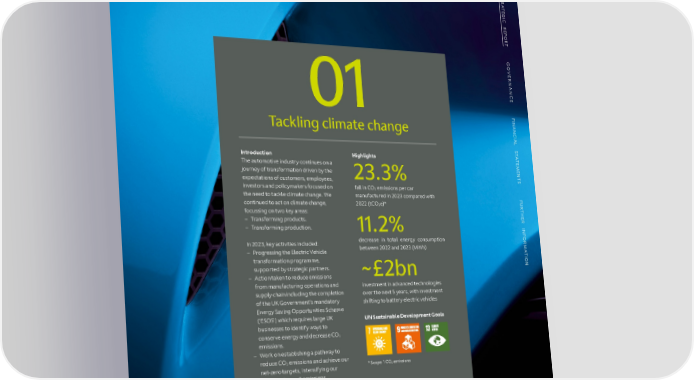 STRATEGIC REPORT ENVIRONMENTAL, SOCIAL AND GOVERNANCE CONTINUED SS TRTR AA TETE GG II CC R R EE PP OO RR TT GG OO VEVE RR NANNAN CC 01 EE FF II NANNAN Tackling climate change CC IALIAL S S TT AA Introduction Highlights TT EE The automotive industry continues on a MM EE journey of transformation driven by the NN TT expectations of customers, employees, 23.3% SS investors and policymakers focused on fall in CO emissions per car 2 the need to tackle climate change. We manufactured in 2023 compared with FF continued to act on climate change, 2022 (tCO e)* UU 2 RR TT focussing on two key areas: HH EE – Transforming products. RR – Transforming production. INF INF 11.2% In 2023, key activities included: decrease in total energy consumption OROR between 2022 and 2023 (MWh) MM – Progressing the Electric Vehicle AA TT II transformation programme, ONON supported by strategic partners. – Action taken to reduce emissions ~£2bn from manufacturing operations and investment in advanced technologies supply chain including the completion over the next 5 years, with investment of the UK Government’s mandatory shifting to battery electric vehicles Energy Saving Opportunities Scheme (‘ESOS’) which requires large UK UN Sustainable Development Goals businesses to identify ways to conserve energy and decrease CO 2 emissions. – Work on establishing a pathway to reduce CO emissions and achieve our 2 * Scope 1 CO emissions net-zero targets, intensifying our 2 focus on Scope 3 emissions. ASTON MARTIN LAGONDA ANNUAL REPORT AND ACCOUNTS 2023 44
