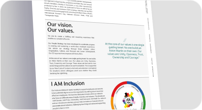 STRATEGIC REPORT ENVIRONMENTAL, SOCIAL AND GOVERNANCE CONTINUED S APPROACH TR We are committed to a workplace and culture where our people feel A connected to Aston Martin’s purpose, that they have a voice, are TE G I listened to and will receive equal treatment to develop and reach their C full potential irrespective of their age, disability, gender reassignment, R E marriage and civil partnership, pregnancy and maternity, race, sex and P O sexual orientation, identity or expression, or any other characteristic R protected by law. In 2023, we continued to focus on delivering our T Equity, Diversity and Inclusion (‘EDI’) strategy. Activities during 2023 included events and engagement coinciding with Black History Month, G International Women’s Day, National Inclusion Week, Pride and O Transgender Week. VE R NAN C Our vision. E F I Our values. NAN C We aim to create a fulfilling and rewarding experience that IAL enables our people to flourish. S T At the core of our values is one single A Our People Strategy has been developed to accelerate progress T E in creating and sustaining a world-class employee experience. guiding tenet: No one builds an M E We deliver our strategy through three strategic pillars: N Aston Martin on their own. Our T Organisation, Culture, and Personal and Career Development. S Our EDI approach encompasses all these pillars. values are: Unity, Openness, Trust, Ownership and Courage.” F At the core of our values is one single guiding tenet: No one builds U R T an Aston Martin on their own. Our values are: Unity, Openness, H E Trust, Ownership and Courage. These values set the tone for how R we do things and the culture we want to establish. This is supported INF by our New Code of Conduct, which sets out a decision-making tool for situations where colleagues aren’t sure whether they would OR M be doing the right thing. A T I ON I AM Inclusion ed I A Our Inclusion Network meets monthly to support employees and seeks to rac M b Ge m n break potential stigma across the organisation by talking about issues that E de affect our employees. We have five dedicated strands within our network AM r I who focus on different areas of equity, diversity, and inclusion. The strands are I AM Gender, I AM Pride, I AM Ability, I AM Embraced, I AM Well. Our network and our strands are voluntary groups that are made up of people who are passionate about inclusion, challenging how things are done and supporting I y people to have a voice. AM lit bi I AM Embraced – Addresses racial I AM Well – Focus on physical and Pr A id M justice, multiculturalism and bias mental health, self-care, stress e I AM Inclusion A management I I AM Pride – Connects LGBTQ+ employees, celebrates pride events I AM Ability – Support for disability, I l and advocates for equality and chronic illness and neurodivergence AM Wel acceptance I AM Ability – Focus on gender identity, equality, work-life balance ASTON MARTIN LAGONDA ANNUAL REPORT AND ACCOUNTS 2023 52