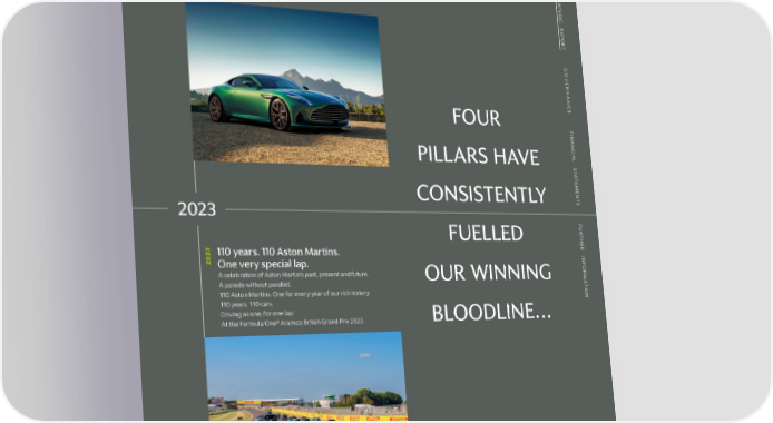 S 23The world’s first super tourer S TR 0 TR 2 DB12. Redefining and reinventing what it means to A A TE be a tourer. An icon risen from 73 years of category TE G defining marvels. Cutting through continents, G I I C C R bruising benchmarks and taming tradition. R E E P P O O R R T T G G O O VE VE R R NAN NAN C C E FOUR E F F I I NAN NAN C C IAL IAL S PILLARS HAVE S T T A A T T E E M M E E N N T T S CONSISTENTLY S 2023 F F U U R R T T H FUELLED H E E R R INF 23110 years. 110 Aston Martins. INF 0 2 OR One very special lap. OR M A celebration of Aston Martin’s past, present and future. M OUR WINNING A A parade without parallel. A T T I I ON 110 Aston Martins. One for every year of our rich history. ON 110 years. 110 cars. Driving as one, for one lap. At the Formula One® Aramco British Grand Prix 2023. BLOODLINE… ASTON MARTIN LAGONDA ANNUAL REPORT AND ACCOUNTS 2023 05
