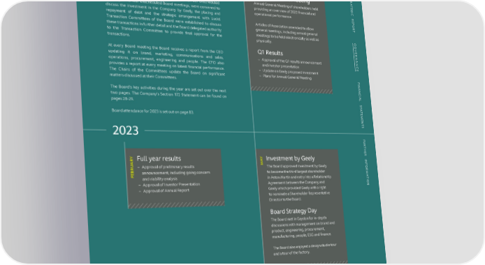 GOVERNANCE BOARD ACTIVITIES S Board activities TR A AYAnnual General Meeting TE The Board met during the year for six scheduled Board meetings, M G Annual General Meeting of shareholders held I C including a Board Strategy Day and an additional four unscheduled providing an overview of 2022 financial and R meetings. The four unscheduled Board meetings, were convened to E operational performance. P discuss the investment in the Company by Geely, the placing and O R repayment of debt and the strategic arrangement with Lucid. Articles of Association amended to allow T Transaction Committees of the Board were established to discuss general meetings, including annual general these transactions in further detail and the Board delegated authority meetings to be held electronically as well as G to the Transaction Committee to provide final approval for the physically. O transactions. VE R At every Board meeting the Board receives a report from the CEO Q1 Results NAN updating it on brand, marketing, communications and sales, – Approval of the Q1 results announcement C operations, procurement, engineering and people. The CFO also and investor presentation E – Update on Geely proposed investment provides a report at every meeting on latest financial performance. The Chairs of the Committees update the Board on significant – Plans for Annual General Meeting F I matters discussed at their Committees. NAN C The Board’s key activities during the year are set out over the next IAL two pages. The Company’s Section 172 Statement can be found on S pages 28-29. T A T E Board attendance for 2023 is set out on page 83. M E N T S 2023 F U R T H E R INF RYFull year results AYInvestment by Geely A M U – Approval of preliminary results The Board approved investment by Geely OR R B announcement, including going concern to become the third largest shareholder M E F A and viability analysis in Aston Martin and entry into a Relationship T I – Approval of Investor Presentation Agreement between the Company and ON – Approval of Annual Report Geely which provided Geely with a right to nominate a Shareholder Representative Director to the Board. Board Strategy Day The Board met in Gaydon for in-depth discussions with management on brand and product, engineering, procurement, manufacturing, people, ESG and finance. The Board also enjoyed a design studio tour and a tour of the factory. ASTON MARTIN LAGONDA ANNUAL REPORT AND ACCOUNTS 2023 86