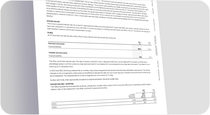 FFIINANNANCCIALIAL S STTAATTEEMMEENNTTSS NOTES TO THE FINANCIAL STATEMENTS CONTINUED S 23 FINANCIAL INSTRUMENTS CONTINUED TR Borrowings continued A Derivative option over own shares continued TE G I The warrants can be exercised from 1 July 2021 through to 7 December 2027. The issuance of debt with attached warrants required the Group to assess C separately the fair value of the warrants and the debt. The fair value of the warrants was determined using a binomial model used to predict the behaviour R E of the warrant holders and when they might exercise their holdings. The derivative option liability was initially recognised as a derivative forward at fair value P O with changes in the fair value being recognised in the Consolidated Income Statement until issuance of the warrants on 7 December 2020 resulting in an R initial valuation of £34.6m. Upon issuance of the $335m SSNs, the carrying value of the debt was reduced by the same amount. The debt will be increased T via an effective interest charge over the term of the SSNs. During the year ended 31 December 2023, changes to the fair value of the derivative option have resulted in a debit to the Consolidated Income Statement of £19.0m (2022: £8.4m credit to the Consolidated Income Statement) which is presented in G adjusting items. A total of 29,969,927 (2022: nil warrants) were exercised, resulting in a £18.6m reduction to the liability (2022: no change to the associated O liability). VE R NAN Interest rate risk C The Group is exposed interest rate risk on the RCF attached to the SSNs and on the bilateral RCF facility with HSBC when drawn, whereby Chinese renminbi E have been deposited in a restricted account with HSBC in China in exchange for a sterling overdraft facility with HSBC in the UK. The interest rate charged on both facilities is based on SONIA and compounded in arrears. F I Profile NAN At 31 December the interest rate profile of the Group’s interest-bearing financial instruments was: C 2023 2022 IAL £m £m S Fixed rate instruments T A T Financial liabilities 980.3 1,104.0 E M E N T Variable rate instruments S Financial liabilities 89.4 107.1 F U The SSNs, are at fixed interest rates. The rate of interest on the RCF, which is attached to the SSNs, and the bilateral RCF are based on SONIA plus a R T percentage spread. As SONIA varies on a daily basis both the RCF and bilateral RCF are considered to be variable rate instruments. The bilateral is now H E drawn as at 31 December 2023. R INF In 2023 and 2022, the Group entered into an inventory repurchase arrangement (not included within the financial liabilities noted above). The interest charged on this arrangement is determined as the difference between the sales and repurchase value and is therefore fixed at the time of entering into OR the arrangement. The repayment terms of this arrangement are not in excess of 270 days. M A T I Surplus cash funds, when appropriate, are placed on deposit and attract interest at variable rates. ON Interest rate risks – sensitivity The following table demonstrates the sensitivity, with all other variables held constant, of the Group’s loss after tax to a reasonably possible change in interest rates on the bilateral RCF with HSBC and the RCF attached to the SSNs. 2023 2022 £m £m Increase/ Effect Effect (decrease) in on loss on loss interest rate after tax after tax SONIA (3.0%) (2.1) (2.6) SONIA 3.0% 2.1 2.6 ASTON MARTIN LAGONDA ANNUAL REPORT AND ACCOUNTS 2023 178