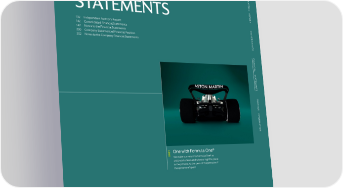 S S TR TR A A TE TE G FINANCIAL G I I C C R R E E P P O O R R T STATEMENTS T G 132 Independent Auditor’s Report G O 142 Consolidated Financial Statements O VE 147 Notes to the Financial Statements VE R R NAN 200 Company Statement of Financial Position NAN 202 Notes to the Company Financial Statements C C E E F F I I NAN NAN C C IAL IAL S S T T A A T T E E M M E E N N T T S S F F U U R R T T H H E E R R INF INF OR OR M M A A T T I I ON ON 21 0 One with Formula One® 2 We make our return to Formula One® as a full works team and take our rightful place in the pit lane. At the peak of the pinnacle of the epitome of sport ASTON MARTIN LAGONDA ANNUAL REPORT AND ACCOUNTS 2023 131