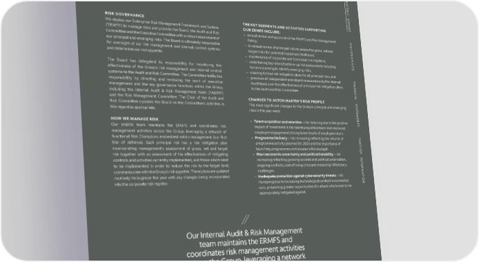STRATEGIC REPORT RISK AND VIABILITY REPORT SS TRTR AA Risk Management TETE GG II CC R R EE PP OO RR RISK GOVERNANCE THE KEY ELEMENTS AND ACTIVITIES SUPPORTING TT We deploy our Enterprise Risk Management Framework and System OUR ERMFS INCLUDE: (‘ERMFS’) to manage risks and provide the Board, the Audit and Risk – annual review and approval of the ERMFS and Risk Management GG Committee and the Executive Committee with a robust assessment of OO Policy; VEVE our principal and emerging risks. The Board is ultimately responsible – bi-annual review of principal risks to assess the gross, net and RR for oversight of our risk management and internal control systems target risks for potential impact and likelihood; NANNAN and determines our risk appetite. – maintenance of corporate and functional risk registers; CC The Board has delegated its responsibility for monitoring the – undertaking top-down/bottom-up risk assessments including EE horizon scanning to identify emerging risks; effectiveness of the Group’s risk management and internal control – creating formal risk mitigation plans for all principal risks; and FF systems to the Audit and Risk Committee. The Committee fulfils this – provision of independent and objective assurance by the Internal II responsibility by directing and reviewing the work of executive NANNAN Audit team over the effectiveness of principal risk mitigation plans management and the key governance functions within the Group, to the Audit and Risk Committee. CC including the Internal Audit & Risk Management team (‘IA&RM’) IALIAL and the Risk Management Committee. The Chair of the Audit and CHANGES TO ASTON MARTIN’S RISK PROFILE S S TT Risk Committee updates the Board on the Committee’s activities in The most significant changes to the Group’s principal and emerging AA TT this regard as appropriate. risks in the year were: EE MM EE NN HOW WE MANAGE RISK – Talent acquisition and retention – risk reducing due to the positive TT Our IA&RM team maintains the ERMFS and coordinates risk impact of investment in the talent acquisition team and improved SS management activities across the Group, leveraging a network of employee engagement driving lower levels of employee churn. FF functional Risk Champions embedded within management (our first – Programme Delivery – risk increasing reflecting the volume of UU RR line of defence). Each principal risk has a risk mitigation plan programme activity planned for 2024 and the importance of TT HH incorporating management’s assessment of gross, net and target launching programmes on time and within budget. EE RR risk together with an assessment of the effectiveness of mitigating – Macroeconomic uncertainty and political instability – risk INF INF controls and activities currently implemented, and those which need increasing reflecting growing societal and political polarisation, to be implemented in order to reduce the risk to the target level ongoing conflicts, cost of living crisis and remaining inflationary OROR commensurate with the Group’s risk appetite. These plans are updated challenges. MM AA routinely throughout the year with any changes being incorporated – Inadequate protection against cybersecurity threats – risk TT II into the corporate risk register. increasing due to increasing technological content in connected ONON cars, presenting greater opportunities for attack which need to be appropriately mitigated against. Our Internal Audit & Risk Management team maintains the ERMFS and coordinates risk management activities across the Group, leveraging a network of functional Risk Champions embedded within management.” ASTON MARTIN LAGONDA ANNUAL REPORT AND ACCOUNTS 2023 64