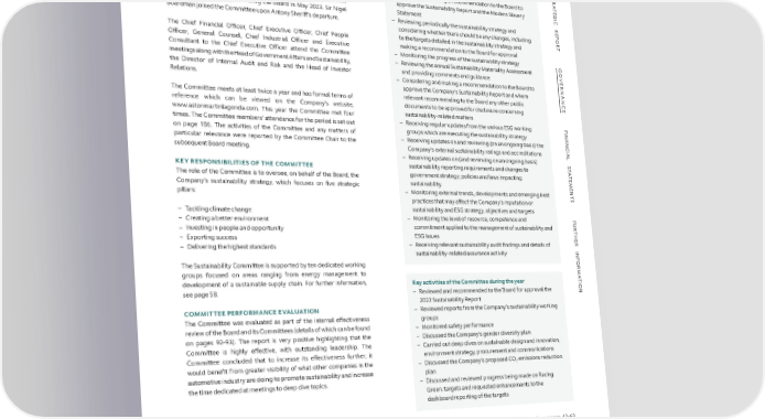 S S TR COMMITTEE MEMBERSHIP AND COMMITTEE MEETINGS Key responsibilities of the Committee TR A The Committee currently comprises three Independent Non- A TE executive Directors: Anne Stevens who is Chair of the Committee, Sir – Reviewing and making a recommendation to the Board to TE G G I approve the Sustainability Report and the Modern Slavery I C Nigel Boardman and Marigay McKee. Antony Sheriff stepped down C R from the Committee upon leaving the Board in May 2023. Sir Nigel Statement R E E P Boardman joined the Committee upon Antony Sheriff’s departure. – Reviewing periodically the sustainability strategy and P O O R considering whether there should be any changes, including R T to the targets detailed in the sustainability strategy and T The Chief Financial OfÏcer, Chief Executive OfÏcer, Chief People making a recommendation to the Board for approval OfÏcer, General Counsel, Chief Industrial OfÏcer and Executive G – Monitoring the progress of the sustainability strategy G Consultant to the Chief Executive OfÏcer attend the Committee O – Reviewing the annual Sustainability Materiality Assessment O VE meetings along with the Head of Government Affairs and Sustainability, VE the Director of Internal Audit and Risk and the Head of Investor and providing comments and guidance R R NAN Relations. – Considering and making a recommendation to the Board to NAN approve the Company’s Sustainability Report and where C relevant recommending to the Board any other public C E The Committee meets at least twice a year and has formal terms of documents to be approved for disclosure concerning E reference which can be viewed on the Company’s website, www.astonmartinlagonda.com. This year the Committee met four sustainability-related matters F – Receiving regular updates from the various ESG working F I times. The Committee members’ attendance for the period is set out I NAN on page 106. The activities of the Committee and any matters of groups which are executing the sustainability strategy NAN C particular relevance were reported by the Committee Chair to the – Receiving updates on and reviewing (on an ongoing basis) the C IAL subsequent Board meeting. Company’s external sustainability ratings and accreditations IAL S – Receiving updates on (and reviewing on an ongoing basis) S T T A KEY RESPONSIBILITIES OF THE COMMITTEE sustainability reporting requirements and changes to A T T E The role of the Committee is to oversee, on behalf of the Board, the government strategy, policies and laws impacting E M M E Company’s sustainability strategy, which focuses on five strategic sustainability E N N T pillars: – Monitoring external trends, developments and emerging best T S S practices that may affect the Company’s reputation or – Tackling climate change sustainability and ESG strategy, objectives and targets F – Monitoring the level of resource, competence and F U – Creating a better environment U R commitment applied to the management of sustainability and R T – Investing in people and opportunity T H ESG issues H E – Exporting success E R R INF – Delivering the highest standards – Receiving relevant sustainability audit findings and details of INF sustainability-related assurance activity OR The Sustainability Committee is supported by ten dedicated working OR M groups focused on areas ranging from energy management to M A A T development of a sustainable supply chain. For further information, Key activities of the Committee during the year T I I ON see page 58. – Reviewed and recommended to the Board for approval the ON 2022 Sustainability Report COMMITTEE PERFORMANCE EVALUATION – Reviewed reports from the Company’s sustainability working The Committee was evaluated as part of the internal effectiveness groups review of the Board and its Committees (details of which can be found – Monitored safety performance on pages 92-93). The report is very positive highlighting that the – Discussed the Company’s gender diversity plan Committee is highly effective, with outstanding leadership. The – Carried out deep dives on sustainable design and innovation, Committee concluded that to increase its effectiveness further, it environment strategy, procurement and communications would benefit from greater visibility of what other companies in the – Discussed the Company’s proposed CO emissions reduction 2 automotive industry are doing to promote sustainability and increase plan the time dedicated at meetings to deep dive topics. – Discussed and reviewed progress being made on Racing. Green. targets and requested enhancements to the dashboard reporting of the targets Further information on sustainability can be found on pages 42-63 and also in the Company’s 2023 Sustainability Report at www.astonmartinlagonda.com. ASTON MARTIN LAGONDA ANNUAL REPORT AND ACCOUNTS 2023 107
