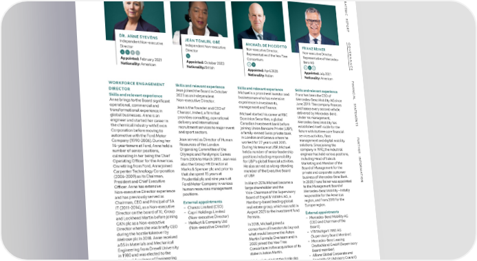 GOVERNANCE BOARD OF DIRECTORS CONTINUED S INDEPENDENT NON-EXECUTIVE DIRECTORS CONTINUED SHAREHOLDER REPRESENTATIVE DIRECTORS TR A TE G I C R E P O R T G O DR. ANNE STEVENS JEAN TOMLIN, OBE MICHAEL DE PICCIOTTO FRANZ REINER VE R Independent Non-executive Independent Non-executive Non-executive Director, Non-executive Director, NAN Director Director Representative of the Yew Tree Representative of Mercedes- A N R S N Consortium Benz AG C Appointed: February 2021 Appointed: October 2023 A W A N R E Nationality: American Nationality: British Appointed: April 2020 Appointed: July 2021 Nationality: Italian Nationality: American F I NAN WORKFORCE ENGAGEMENT Skills and relevant experience Skills and relevant experience Skills and relevant experience C DIRECTOR Jean joined the Board in October Michael is a prominent investor and Franz has been the CEO of IAL 2023 as an Independent businessman who has extensive Mercedes-Benz Mobility AG since S Skills and relevant experience Non-executive Director. experience in investments, June 2019. The company finances T Anne brings to the Board significant A management and finance. and leases every second vehicle T operational, commercial and Jean is the founder and CEO of E transformational experience in delivered by Mercedes-Benz. M Chanzo Limited, a firm that Michael started his career at RBC E global businesses. Anne is an Under his management, N provides consulting, operational Dominion Securities, a global Mercedes-Benz Mobility has T engineer and started her career in delivery and international Canadian investment bank before established itself viable for the S the chemical industry with Exxon recruitment services to major event joining Union Bancaire Privée (UBP), Corporation before moving to and sport sectors. a family-owned Swiss private bank future with its three core financial automotive with the Ford Motor services activities, fleet F Jean served as Director of Human in London and Geneva where he management and digital mobility U Company (1990-2006). During her R Resources of the London worked for 27 years until 2015. solutions. Since joining the T 16-year tenure at Ford, Anne held a During his tenure at UBP, Michael H Organising Committee of the company in 1992, the industrial E number of senior positions, held a number of senior leadership R culminating in her being the Chief Olympic and Paralympic Games positions including responsibility engineer has held various positions, INF from 2006 to March 2013. Jean was including Head of Sales & Operating OfÏcer for the Americas. also the Group HR Director at for UBP’s global financial activities. Marketing and Member of the OR On retiring from Ford, Anne joined He also served as a long-standing Carpenter Technology Corporation Marks & Spencer plc and prior to member of the Executive Board Board of Management for the M that she spent 15 years at private and corporate customer A (2006-2009) as its Chairman, of UBP. T I President and Chief Executive Prudential plc and nine years at business of Mercedes-Benz Bank. ON Ford Motor Company in various In March 2016 Michael became a In 2009, Franz Reiner was appointed OfÏcer. Anne has extensive human resources management large shareholder and the to the Management Board of Non-executive Director experience positions. Vice-Chairman of the Supervisory Mercedes-Benz Mobility – initially and has previously served as Board of Engel & Volkërs AG, a responsible for the Americas Chairman, CEO and Principal of SA External appointments Hamburg-based leading global region, and from 2011 for the IT (2011-2014), as a Non-executive – Chanzo Limited (CEO) real estate group, which was sold in Europe region. Director on the board of XL Group – Capri Holdings Limited August 2021 to the investment fund and Lockheed Martin before joining External appointments GKN plc as a Non-executive (Non-executive Director) Permira. – Hakluyt & Company Ltd – Mercedes-Benz Mobility AG Director where she was briefly CEO In 2018, Michael joined a (CEO and Chairman of the during the hostile takeover by (Non-executive Director) consortium of investors to buy out Melrose plc in 2018. Anne received Board) what would become the Aston – VfB Stuttgart 1983 AG a BS in Materials and Mechanical Martin Formula One team and in Engineering from Drexel University (Supervisory Board Member) 2020 joined the Yew Tree – Mercedes-Benz Leasing in 1980 and was elected to the Consortium in the acquisition of its Deutschland GmbH (Supervisory National Academy of Engineering stake in Aston Martin. in 2004. Board member) Michael studied at the Ecole des – Allianz Global Corporate and Speciality SE (Advisory Council) External appointments Hautes Etudes Commerciales at the – Harbour Energy plc University of Lausanne. (Non-executive Director and External appointments Remuneration Committee Chair) – AMR GP Holdings Limited (Director) – AMR Performance Group Key Limited (Director) Chair Observer A Audit and Risk Committee N Nomination Committee R Remuneration Committee S Sustainability Committee W Warrant Share Committee ASTON MARTIN LAGONDA ANNUAL REPORT AND ACCOUNTS 2023 78