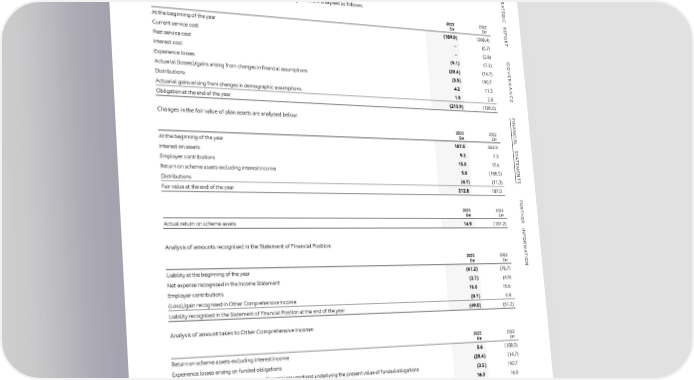 NOTES TO THE FINANCIAL STATEMENTS CONTINUED S S 26 PENSION OBLIGATIONS CONTINUED TR26 PENSION OBLIGATIONS CONTINUED TR Assumptions continued AAssumptions continued A TE TE G G I I The following table provides information on the composition and fair value of the assets of the scheme: CChanges in present value of the Defined Benefit pensions obligations are analysed as follows: C 31 December 31 December 31 December 31 December 31 December 31 December R R E 2023 2022 E 2023 2023 2023 2022 2022 2022 P £m £m P Quoted Unquoted Total Quoted Unquoted Total O O R At the beginning of the year (189.0) (368.4) R £m £m £m £m £m £m TCurrent service cost – (0.7) T Asset class Past service cost – (2.8) G G Overseas equities 5.6 – 5.6 25.9 – 25.9 OInterest cost (9.1) (7.2) O Private debt – 30.7 30.7 – 34.6 34.6 VEExperience losses (20.4) (14.7) VE R R Asset-Backed Securities 4.3 – 4.3 37.7 – 37.7 NANActuarial (losses)/gains arising from changes in financial assumptions (3.5) 190.7 NAN Liability driven investment 133.3 3.3 136.6 26.3 9.5 35.8 Distributions 4.2 11.3 Corporate bonds – – – 24.5 – 24.5 C C Absolute return bonds – – – – 11.2 11.2 EActuarial gains arising from changes in demographic assumptions 1.9 2.8 E Diversified alternatives – – – – 0.9 0.9 Obligation at the end of the year (215.9) (189.0) F F I I Cash 30.9 – 30.9 12.8 – 12.8 NANChanges in the fair value of plan assets are analysed below: NAN Insurance policies 4.7 – 4.7 3.6 – 3.6 C 2023 2022 C Total 178.8 34.0 212.8 130.8 56.2 187.0 IAL £m £m IAL The scheme assets and funded obligations at 31 December are summarised below: SAt the beginning of the year 187.0 363.9 S T T 2023 2022 A Interest on assets 9.3 7.3 A £m £m T T E E Total fair value of scheme assets 212.8 187.0 MEmployer contributions 15.0 15.6 M E E N Return on scheme assets excluding interest income 5.6 (188.5) N Present value of funded obligations (215.9) (188.9) T T Funded status at the end of the year (3.1) (1.9) SDistributions (4.1) (11.3) S Adjustment to reflect minimum funding requirements (45.9) (59.3) Fair value at the end of the year 212.8 187.0 F F Liability recognised in the Statement of Financial Position (49.0) (61.2) U U R R T 2023 2022 T H £m £m H E E The adjustment to reflect minimum funding requirements represents the excess of the present value of contractual future recovery plan contributions, R R discounted using the assumed scheme discount rate, over the funding status established through the actuarial valuation. INFActual return on scheme assets 14.9 (181.2) INF Amounts recognised in the Consolidated Income Statement during the year ended 31 December were as follows: OR OR M Analysis of amounts recognised in the Statement of Financial Position: M 2023 2022 A A £m £m T 2023 2022 T I I Amounts charged to operating loss: ON £m £m ON Current service cost – (0.7) Liability at the beginning of the year (61.2) (78.7) Past service cost – (2.8) Net expense recognised in the Income Statement (2.7) (4.9) – (3.5) Employer contributions 15.0 15.6 Amounts charged to finance expense: (Loss)/gain recognised in Other Comprehensive Income (0.1) 6.8 Net interest expense on the net Defined Benefit liability 0.2 0.1 Liability recognised in the Statement of Financial Position at the end of the year (49.0) (61.2) Interest expense on the adjustment to reflect minimum funding requirements (2.9) (1.5) Analysis of amount taken to Other Comprehensive Income: Total expense recognised in the Income Statement (2.7) (4.9) 2023 2022 £m £m Return on scheme assets excluding interest income 5.6 (188.5) Experience losses arising on funded obligations (20.4) (14.7) (Losses)/gains arising due to changes in financial assumptions underlying the present value of funded obligations (3.5) 190.7 Gains arising as a result of adjustment made to reflect minimum funding requirements 16.3 16.5 Gains arising due to changes in demographic assumptions 1.9 2.8 Amount recognised in Other Comprehensive Income (0.1) 6.8 ASTON MARTIN LAGONDA ANNUAL REPORT AND ACCOUNTS 2023 189