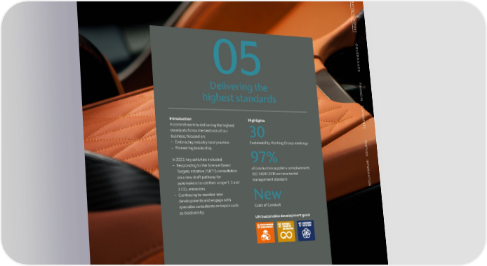 STRATEGIC REPORT ENVIRONMENTAL, SOCIAL AND GOVERNANCE CONTINUED SS TRTR AA TETE GG II CC R R EE PP OO RR TT GG OO VEVE RR NANNAN CC 05 EE FF II NANNAN Delivering the CC IALIAL S S highest standards TT AA TT EE MM EE Introduction Highlights NN TT A commitment to delivering the highest SS standards forms the bedrock of our 30 business, focused on: FF – Embracing industry best practice. UU Sustainability Working Group meetings RR TT – Pioneering leadership. HH EE RR In 2023, key activities included: INF INF 97% – Responding to the Science Based of production suppliers compliant with OROR Targets initiative (‘SBTi’) consultation ISO 14001:2015 environmental MM on a new draft pathway for AA management standard TT II automakers to cut their scope 1, 2 and ONON 3 CO emissions. 2 – Continuing to monitor new developments and engage with New specialist consultants on topics such Code of Conduct as biodiversity. UN Sustainable development goals ASTON MARTIN LAGONDA ANNUAL REPORT AND ACCOUNTS 2023 56
