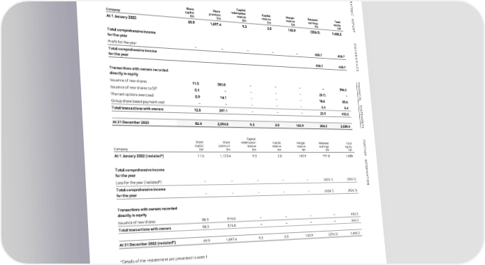 PARENT COMPANY FINANCIAL STATEMENTS PARENT COMPANY FINANCIAL STATEMENTS CONTINUED S S TR TR Parent Company Statement of Financial Position Parent Company Statement of Changes in Equity A A TE TE as at 31 December 2023 Gfor the year ended 31 December 2023 G I I C C 31 December 1 January 2022 R Capital R E E 31 December 2023 2022 (restated*) (restated*) P Share Share redemption Capital Merger Retained Total P Notes £m £m £m O capital premium reserve reserve reserve earnings equity O R R Non-current assets TCompany £m £m £m £m £m £m £m T Investments 3 1,051.5 497.3 957.4 At 1 January 2023 69.9 1,697.4 9.3 2.0 143.9 (256.3) 1,666.2 Debtors: amounts falling due after one year 4 1,699.7 1,382.1 749.7 G G O Total comprehensive income O VE VE for the year Current assets R R NAN NAN Profit for the year – – – – – 438.7 438.7 Debtors: amounts falling due within one year 4 – 0.3 – Total comprehensive income Total assets 2,751.2 1,879.7 1,707.1 C C for the year 438.7 438.7 E E Current liabilities Transactions with owners recorded F F I I NAN NAN Creditors: amounts falling due within one year 5 (212.8) (213.5) (219.1) directly in equity Net assets 2,538.4 1,666.2 1,488.0 Issuance of new shares 11.5 383.0 – – – – 394.5 C C IAL Issuance of new shares to SIP IAL 0.1 – – – – (0.1) – S S Capital and reserves Warrant options exercised 0.9 14.1 – – – 18.6 33.6 T T A A Share capital 6 82.4 69.9 11.6 Group share based payment cost – – – – – 5.4 5.4 T T E E Total transactions with owners 12.5 397.1 – – – 23.9 433.5 Share premium 2,094.5 1,697.4 1,123.4 M M E E N N Capital redemption reserve 6 9.3 9.3 9.3 T T Capital reserve 6 2.0 2.0 2.0 SAt 31 December 2023 82.4 2,094.5 9.3 2.0 143.9 206.3 2,538.4 S Merger reserve 6 143.9 143.9 143.9 Retained earnings 206.3 (256.3) 197.8 F Capital F U U R Share Share redemption Capital Merger Retained Total R y 2,538.4 1,666.2 1,488.0 T T Shareholder equit capital premium reserve reserve reserve earnings equity H Company £m £m £m £m £m £m £m H E E * Details of the restatement are presented in note 1. R R INF INF At 1 January 2022 (restated*) 11.6 1,123.4 9.3 2.0 143.9 197.8 1,488 The Financial Statements were approved by the Board of Directors on 27 February 2024 and were signed on its behalf by OR Total comprehensive income OR AMEDEO FELISA DOUG LAFFERTY M M A for the yea A r CHIEF EXECUTIVE OFFICER CHIEF FINANCIAL OFFICER T T I I Company Number: 11488166 ONLoss for the year (restated*) – – – – – (454.1) (454.1) ON Total comprehensive income The profit on ordinary activities after taxation amounts to £438.7m (2022 (restated): loss of £454.1m). for the year – – – – – (454.1) (454.1) Transactions with owners recorded directly in equit y Issuance of new shares 58.3 574.0 – – – – 632.3 Total transactions with owners 58.3 574.0 – – – – 632.3 At 31 December 2022 (restated*) 69.9 1,697.4 9.3 2.0 143.9 (256.3) 1,666.2 *Details of the restatement are presented in note 1. ASTON MARTIN LAGONDA ANNUAL REPORT AND ACCOUNTS 2023 201