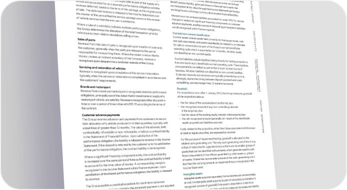 NOTES TO THE FINANCIAL STATEMENTS CONTINUED S S 1 BASIS OF ACCOUNTING CONTINUED Foreign currency translation TR2 ACCOUNTING POLICIES CONTINUED Finance expense TR Going concern continued Transactions in foreign currencies are initially recorded in the functional ARevenue recognition continued Finance expense comprises interest payable on borrowings calculated using A The Directors have considered a severe but plausible downside scenario currency of the operation by applying the exchange rate ruling at the date TEWarranties are issued on new vehicles sold with no separate purchase the effective interest rate method, interest expense on the net Defined TE G G I I that includes considering the impact of a 15% reduction in DBX volumes of the transaction. Monetary assets and liabilities denominated in foreign Coption available to the customer and, on this basis, are accounted for in Benefit pension liability, gains and losses on financial instruments that C and a 10% reduction in sports volumes from forecast levels covering, currencies are retranslated at the rate of exchange ruling at the reporting Raccordance with IAS 37. Service packages sold as part of the supply of a are recognised at fair value through the Income Statement and foreign R E E although not exclusively, instances of reduced volume due to delayed date. All differences are taken to the Income Statement except for the Pvehicle are accounted for as a separate performance obligation with the exchange losses on foreign currency denominated financial liabilities. P O O product launches, operating costs higher than the base plan, incremental translational differences on monetary items that form part of designated Rrevenue deferred, based on the term of the package, at the original point R working capital requirements such as a reduced deposit inflows or hedge relationships. Tof sale. The deferred revenue is released to the Income Statement over Interest incurred on lease liabilities accounted for under IFRS 16, interest T increased deposit outflows and the impact of the strengthening of the the shorter of the period that the service package covers or the number charged in relation to significant financing components on customer The assets and liabilities of foreign operations are translated into sterling advance payments, and the unwind of discounting on long term liabilities sterling dollar exchange rate. Gof vehicle services that the end user is entitled to. G at the rate of exchange ruling at the reporting date. Income and expenses O are all recognised within finance expense. O The Group plans to make continued investment for growth in the period are translated at average exchange rates for the period. The resulting VEWhere a sale of a vehicle(s) includes multiple performance obligations, VE and, accordingly, funds generated through operations are expected to be exchange differences are taken through Other Comprehensive Income Rthe Group determines the allocation of the total transaction price by Current/non-current classification R reinvested in the business mainly through new model development and to the translation reserve. On disposal of a foreign entity, the deferred NANreference to their relative standalone selling prices. Current assets include assets held primarily for trading purposes, cash NAN and cash equivalents, and assets expected to be realised in, or intended other capital expenditure. To a certain extent, such expenditure is cumulative amount recognised in the translation reserve relating to the C C discretionary and, in the event of risks occurring which could have a foreign operation is recognised in the Income Statement. ESales of parts for sale or consumption as part of the Group’s normal identifiable E particularly severe effect on the Group, as identified in the severe but Revenue from the sale of parts is recognised upon transfer of control to operating cycle which is assumed to be 12 months. All other assets Non-monetary items that are measured in terms of historical cost in a the customer, generally when the parts are released to the carrier are classified as non-current assets. plausible downside scenario, actions such as constraining capital F F foreign currency are translated using the exchange rates as at the dates Iresponsible for transporting them. Where the dealer is Aston Martin I spending, working capital improvements, reduction in marketing of the initial transactions. Non-monetary items measured at fair value in a NANWorks Limited, an indirect subsidiary of the Company, revenue is Current liabilities include liabilities held primarily for trading purposes in NAN expenditure and the continuation of strict and immediate expense control line with the Group’s identifiable normal operating cycle. These liabilities foreign currency are translated using the exchange rates at the date when Crecognised upon despatch to a customer outside of the Group. C would be taken to safeguard the Group’s financial position. the fair value was determined. IAL are expected to be settled as part of the Group’s normal course of IAL In addition, we also considered the circumstances which would be needed SServicing and restoration of vehicles business. All other liabilities are classified as non-current liabilities. S Revenue recognition TRevenue is recognised upon completion of the service /restoration Customer deposits and advances are typically presented as current, T to exhaust the Group’s liquidity over the assessment period, a reverse A A T T Revenue is recognised when the Group satisfies its performance Etypically when the service or restoration is completed in accordance with although, due to the timing between deposit payment and a sale E stress test. This would indicate that vehicle sales would need to reduce by obligation to supply a product or service to the customer. Revenue is Mthe customers’ requirements. completing, can take longer than 12 months to unwind. M E E more than 15% from forecast l