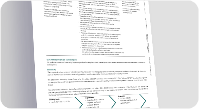 FINANCIAL STATEMENTS INDEPENDENT AUDITOR’S REPORT TO THE MEMBERS OF ASTON MARTIN LAGONDA GLOBAL HOLDINGS PLC CONTINUED S Parent Company Investment impairment – We confirmed the existence and the design effectiveness of controls Our year end audit procedures TR A (Investment: £1,051.6m, 2022: £497.3m) around management’s impairment assessment for investment in did not identify evidence of TE (Impairment reversal: £460.1m, 2022 subsidiaries. material misstatement regarding G I Impairment charge: £460.1m) – We considered the indicators of investment reversal, being the new the reversal of the impairment in C medium term targets announced by management at the capital investment in subsidiaries. R Refer to the Audit Committee Report (pages E markets day as well as the increase in the Groups market capitalisation P 98-101); Accounting policies (page 203); The prior year adjustment related O in the year. R and Note 3 of the Parent Company Financial – We examined management’s methodology and model for assessing to the 2022 balance sheet is T Statements (page 205) the VIU for investment in subsidiaries. This included assessing the cash materially stated. There is a risk that the parent company flow forecasts relating to the repayment of intercompany payables to G investment impairment/impairment reversal the parent company. O is not supported by the subsidiaries future – We confirmed the underlying cash flows are consistent with the VE forecast cashflows. Board approved business plan and appropriately reflect the effects of R material climate risks as disclosed on pages 61-62. NAN – We re-performed the calculations in the model to test the C mathematical integrity. E – We calculated the degree to which the key assumptions would need to fluctuate before there is a change in the impairment/impairment reversal. F I – We assessed the discount rate used by obtaining the underlying data NAN used in the calculation and benchmarking it against comparable C organisations and market data with the support of our valuation IAL specialists. S – We have further reviewed managements cash flow forecasts used T A to support the repayment of intercompany payables to the parent T E company (outside of the Group VIU). M – We considered sensitivity analysis about what changes in assumptions E N could individually lead to a different conclusion. T – We audited the disclosures in respect of impairment of investments and S confirm their consistency with the audited impairment models. F U R OUR APPLICATION OF MATERIALITY T H We apply the concept of materiality in planning and performing the audit, in evaluating the effect of identified misstatements on the audit and in forming our E R audit opinion. INF Materiality OR M The magnitude of an omission or misstatement that, individually or in the aggregate, could reasonably be expected to influence the economic decisions of the A T users of the financial statements. Materiality provides a basis for determining the nature and extent of our audit procedures. I ON We determined materiality for the Group to be £7.5 million (2022: £4.75 million), which is 2.5% (2022: 2.5%) of Adjusted EBITDA. We believe that Adjusted EBITDA provides us with an appropriate basis for materiality as it is a key metric used by investors and management in assessing the performance of the Group. We determined materiality for the Parent Company to be £25.4 million (2022: £30.8 million), which is 1% (2022: 1.5%) of Equity. We have reduced the percentage applied to determine materiality in the current year as a result of the prior year adjustments identified. When auditing balances included within to the Group financial statements we reduced this to the Group materiality. Starting basis Adjustments Materiality – Loss before Tax – £239.8m – Adjusting items – £68.0m – EBITDA – £305.9m – Adjusted net finance – Materiality of £7.5m (2.5% of expense – £92.1m materiality basis) – Depreciation and Amortisation – £385.6m During the course of our audit, we reassessed initial materiality and updated this for actual results. ASTON MARTIN LAGONDA ANNUAL REPORT AND ACCOUNTS 2023 138