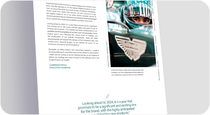 STRATEGIC REPORT EXECUTIVE CHAIRMAN’S STATEMENT CONTINUED SS Our fantastic partnership with the Aston Martin F1® Team sits at TRTR the heart of our brand, with other key marketing activities in 2023 AA th TETE including the global celebration of our historic 110 anniversary and GG II continued implementation of our renewed corporate identity across CC our network. R R EE PP OO A key landmark in that ultra-luxury retail strategy was achieved in June RR TT 2023, with the opening of our first global flagship location, Q New York, on one of the most prominent corners of Midtown Manhattan. Where Savile Row meets Park Avenue, the new showroom brings GG the highest levels of our Q by Aston Martin bespoke service to OO VEVE North America for the very first time, providing the most sophisticated RR luxury specification experience available anywhere in the world. NANNAN CC Looking ahead to 2024, it is a year that promises to be a significant EE and exciting one for the brand, with the highly anticipated arrival of thrilling new products. This includes the future development of our FF portfolio with the completion of our line-up of next generation, front- II engine sports cars, following the recent unveil of Vantage, and NANNAN the continuation of our Specials programmes. These and other CC advancements will support the delivery of the Company’s near- and IALIAL T S S medium-term financial targets, as we unleash the power of our S E TT brand and continue our growth trajectory. AA N T TT I EE A MM R Alongside my fellow leaders and consortium members, I couldn’t EE H NN be more enthusiastic about the opportunities ahead for Aston Martin. A TT I thank you for joining us on our exciting journey as we continue to L B SS L deliver our strategy and move forward on the pathway we’ve now O R T FF forged towards our targets. UU E S RR C TT N HH LAWRENCE STROLL A EE L RR EXECUTIVE CHAIRMAN INF INF In the 2023 season, Aston Martin experienced a 20% increase in on-line configurations sent to dealers on OROR race weekends compared with non-race weekends. MM AA TT II ONON Looking ahead to 2024, it is a year that promises to be a significant and exciting one for the brand, with the highly anticipated arrival of thrilling new products.” ASTON MARTIN LAGONDA ANNUAL REPORT AND ACCOUNTS 2023 16