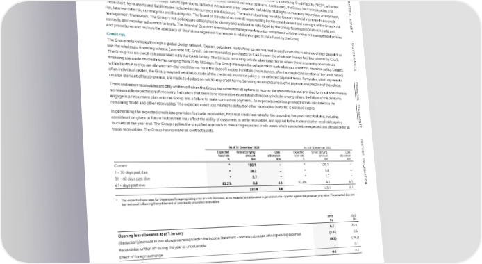 FFIINANNANCCIALIAL S STTAATTEEMMEENNTTSS NOTES TO THE FINANCIAL STATEMENTS CONTINUED S 23 FINANCIAL INSTRUMENTS TR Group A The Group's principal financial instruments comprise cash and cash equivalents, Senior Secured Notes (“SSNs”), a Revolving Credit Facility (“RCF”), a finished TE G I vehicle financing facility, a bilateral RCF, loan assets, derivative options, and forward currency contracts. Additionally, the Group has trade payables and C trade receivables which arise directly from its operations. Included in trade and other payables is a liability relating to an inventory repurchase arrangement. R E These short-term assets and liabilities are included in the currency risk disclosure. The main risks arising from the Group's financial instruments are credit P O risk, interest-rate risk, currency risk and liquidity risk. The Board of Directors has overall responsibility for the establishment and oversight of the Group's risk R management framework. The Group's risk policies are established to identify and analyse the risks faced by the Group, to set appropriate risk limits and T controls, and monitor adherence to limits. The Board of Directors oversees how management monitor compliance with the Group risk management policies and procedures and reviews the adequacy of the risk management framework in relation to specific risks faced by the Group. G O Credit risk VE The Group sells vehicles through a global dealer network. Dealers outside of North America are required to pay for vehicles in advance of their despatch or R use the wholesale financing scheme (see note 18). Credit risk on receivables purchased by CAAB under the wholesale finance facilities is borne by CAAB. NAN The Group has no credit risk associated with the CAAB facility. The Group’s remaining vehicle sales to territories where there is currently no wholesale C financing are made on credit terms ranging from 30 to 180 days. The Group manages the default risk of such sales via a credit risk insurance policy. Dealers E within North America are allowed ten-day credit terms from the date of invoice. In certain circumstances, after thorough consideration of the credit history of an individual dealer, the Group may sell vehicles outside of the credit risk insurance policy or on deferred payment terms. Parts sales, which represent a F I smaller element of total revenue, are made to dealers on net 30-day credit terms. Servicing receivables are due for payment on collection of the vehicle. NAN Trade and other receivables are only written off when the Group has exhausted all options to recover the amounts due and provided for in full when there is C no reasonable expectation of recovery. Indicators that there is no reasonable expectation of recovery include, among others, the failure of the debtor to IAL engage in a repayment plan with the Group and a failure to make contractual payments. An expected credit loss provision is then calculated on the S T remaining trade and other receivables. The expected credit loss related to default of other receivables (note 18) is assessed as zero. A T E In generating the expected credit loss provision for trade receivables, historical credit loss rates for the preceding five years are calculated, including M E N consideration given to future factors that may affect the ability of customers to settle receivables, and applied to the trade and other receivable ageing T buckets at the year end. The Group applies the simplified approach to measuring expected credit losses which uses a lifetime expected loss allowance for all S trade receivables. The Group has no material contract assets. F U R T As at 31 December 2023 As at 31 December 2022 H E Expected Gross carrying Loss Expected Gross carrying Loss R loss rate amount allowance loss rate amount allowance INF % £m £m % £m £m OR Current * 180.1 – * 129.1 – M 1 – 30 days past due * 28.2 – * 5.8 – A T 31 – 60 days past due * 3.7 – * 1.7 – I ON 61+ days past due 52.2% 8.8 4.6 93.8% 6.5 6.1 220.8 4.6 143.1 6.1 * The expected loss rates for these specific ageing categories are not disclosed, as no material loss allowance is generated when applied against the gross carrying value. The expected loss rate has reduced following the settlement of previously provided receivables. 2023 2022 £m £m Opening loss allowance as at 1 January 6.1 24.6 (Reduction)/increase in loss allowance recognised in the Income Statement – administrative and other operating expenses (1.3) 0.6 Receivables written off during the year as uncollectible (0.2) (19.2) Effect of foreign exchange – 0.1 At 31 December 4.6 6.1 ASTON MARTIN LAGONDA ANNUAL REPORT AND ACCOUNTS 2023 176
