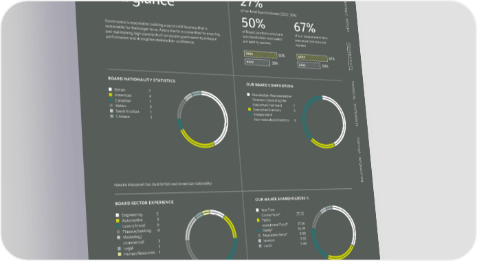 GOVERNANCE GOVERNANCE AT A GLANCE SS BOARD GENDER STATISTICS TRTR AA Governance TETE GG II 27% CC R R at a glance of our total Board is female (2022: 30%) EE PP OO RR TT 50% 67% Governance is essential to building a successful business that is of Board positions which are of our Independent Non- sustainable for the longer term. Aston Martin is committed to ensuring not shareholder nominated executive Directors are GG OO and maintaining high standards of corporate governance to enhance are held by women women VEVE performance and strengthen stakeholder confidence. RR 2023 50% 2023 67% NANNAN CC 2022 38% 2022 50% EE FF II BOARD NATIONALITY STATISTICS OUR BOARD COMPOSITION NANNAN CC British 7 Shareholder Representative IALIAL American 4 Directors (including the S S TT Canadian 1 Executive Chairman) 7 AA TT Italian 2 Executive Directors 3 EE MM Saudi Arabian 1 Independent EE NN Chinese 1 Non-executive Directors 6 TT SS FF UU RR TT HH EE RR INF INF OROR MM AA TT II Natalie Massenet has dual British and American nationality ONON BOARD SECTOR EXPERIENCE OUR MAJOR SHAREHOLDERS % Engineering 2 Yew Tree Automotive 3 Consortium* 25.32 Luxury brand 6 Public Finance/banking 4 Investment Fund* 17.06 Marketing/ Geely* 16.09 commercial 3 Mercedes-Benz* 8.90 Legal 1 Invesco 3.62 Human Resources 1 Lucid 3.44 * Denotes a major shareholder with Board representation in accordance with the respective Relationship Agreement Some members of the Board have sector experience in more than entered into between the Company and that shareholder. one category ASTON MARTIN LAGONDA ANNUAL REPORT AND ACCOUNTS 2023 74