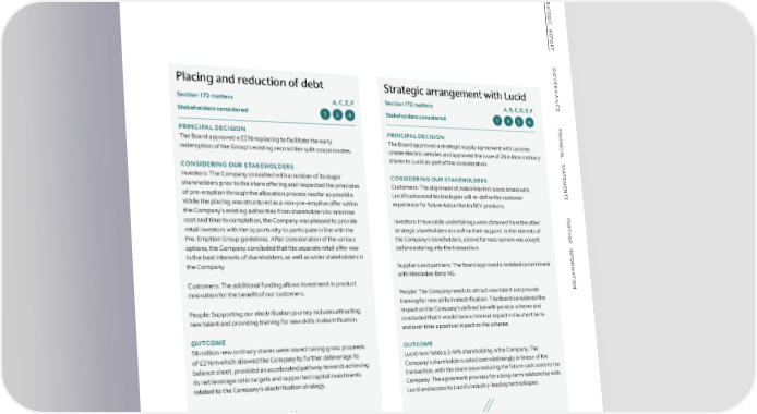 S S TR TR A A TE TE G G I I C C R R E E P P O O R R T T G G O O VE VE R R NAN NAN Placing and reduction of debt Strategic arrangement with Lucid C C E Section 172 matters A, C, E, F Section 172 matters A, B, C, D, E, F E Stakeholders considered 1 3 4 Stakeholders considered 1 4 5 6 F F I I NAN NAN PRINCIPAL DECISION PRINCIPAL DECISION C C IAL The Board approved a £216m placing to facilitate the early The Board approved a strategic supply agreement with Lucid to IAL S redemption of the Group’s existing second lien split coupon notes. create electric vehicles and approved the issue of 28 million ordinary S T shares to Lucid as part of the consideration. T A A T CONSIDERING OUR STAKEHOLDERS T E E M Investors: The Company consulted with a number of its major CONSIDERING OUR STAKEHOLDERS M E E N shareholders prior to the share offering and respected the principles Customers: The alignment of Aston Martin’s iconic brand with N T T S of pre-emption through the allocation process insofar as possible. Lucid’s advanced technologies will re-define the customer S While the placing was structured as a non-pre-emptive offer within experience for future Aston Martin BEV products. the Company’s existing authorities from shareholders to minimise F F U cost and time to completion, the Company was pleased to provide Investors: Irrevocable undertakings were obtained from the other U R R T T H retail investors with the opportunity to participate in line with the strategic shareholders to confirm their support. In the interests of H E E R Pre-Emption Group guidelines. After consideration of the various the Company’s bondholders, a bond fairness opinion was sought R INF options, the Company concluded that the separate retail offer was before entering into the transaction. INF OR in the best interests of shareholders, as well as wider stakeholders in OR M the Company. Suppliers and partners: The Board approved a restated commitment M A with Mercedes-Benz AG. A T T I I ON Customers: The additional funding allows investment in product People: The Company needs to attract new talent and provide ON innovation for the benefit of our customers. training for new skills in electrification. The Board considered the impact on the Company’s defined benefit pension scheme and People: Supporting our electrification journey includes attracting concluded that it would have a minimal impact in the short term new talent and providing training for new skills in electrification. and over time a positive impact on the scheme. OUTCOME 58 million new ordinary shares were issued raising gross proceeds OUTCOME of £216m which allowed the Company to further deleverage its Lucid now holds a 3.44% shareholding in the Company. The balance sheet, provided an accelerated pathway towards achieving Company’s shareholders voted overwhelmingly in favour of the its net leverage ratio targets and supported capital investments transaction, with the share issue reducing the future cash costs to the Company. The agreement provides for a long-term relationship with related to the Company’s electrification strategy. Lucid and access to Lucid’s industry-leading technologies. The tremendous backing from our The supply agreement with Lucid is a largest shareholders along with the game changer for the future EV-led strong appetite from institutional and growth of Aston Martin.” retail investors demonstrates the continued confidence in Aston Martin and our future direction.” ASTON MARTIN LAGONDA ANNUAL REPORT AND ACCOUNTS 2023 29