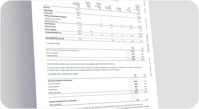 NOTES TO THE FINANCIAL STATEMENTS CONTINUED S S 16 LEASES CONTINUED TR 16 LEASES CONTINUED TR b) Obligations under leases Ab) Obligations under leases continued A The maturity profile of undiscounted lease cash flows accounted for under IFRS 16 is: TEThe impact of IFRS 16 on the Consolidated Income Statement, excluding tax, for the year ended 31 December 2022 is: TE G G I I C C 2023 2022 R Excluding R £m £m Add back Add back impact of E As reported IFRS 16 IFRS 16 Less Less IFRS 16 E Less than one year 12.7 9.9 P P O 31 December interest depreciation amortisation Less lease IAS 17 31 December O R 2022 charge charge of legal fees incentives lease cost 2022 R One to five year 40.3 39.1 T £m £m £m £m £m £m £m T More than five years 82.8 90.1 Revenue 1,381.5 – – – – – 1,381.5 135.8 139.2 G G Cost of sales (930.8) – – – – – (930.8) O O VE VE Gross profit 450.7 – – – – – 450.7 The maturity profile of discounted lease cash flows accounted for under IFRS 16 is: R R Selling and distribution expenses (113.0) – – – – – (113.0) 2023 2022 NAN Administrative and other NAN £m £m operating expenses (479.5) – 11.0 (0.1) 1.1 (14.5) (482.0) C C Less than one year 8.8 7.4 E E Operating loss (141.8) – 11.0 (0.1) 1.1 (14.5) (144.3) One to five years 28.5 26.8 Finance income 15.5 – – – – – 15.5 More than five years 60.0 65.6 F F Finance expense (368.7) 4.5 – – – – (364.2) I I 97.3 99.8 NAN NAN (Loss)/profit before tax (495.0) 4.5 11.0 (0.1) 1.1 (14.5) (493.0) Analysed as: C C IAL IAL Current 8.8 7.4 S S Adjusted EBITDA (note 34) 190.2 – – (0.1) 1.1 (14.5) 176.6 Non-current 88.5 92.4 T T A A 97.3 99.8 T T E 17 INVENTORIES E M 2023 2022 M E E A reconciliation of the lease liability from 1 January to 31 December for the current and prior year is disclosed within note 28. N £m £m N T T The total lease interest expense for the year ended 31 December 2023 was £4.1m (2022: £4.5m). Total cash outflow for leases accounted for under IFRS 16 SParts for resale, service parts and production stock 157.7 152.2 S for the current year was £7.9m (2022: £10.0m). Expenses charged to the Consolidated Income Statement for short-term leases for the year ended 31 Work in progress 33.2 48.5 December 2023 were £0.3m (2022: £0.7m). The portfolio of short-term leases at 31 December 2023 is representative of the expected annual short-term FFinished vehicles 81.8 85.5 F U U lease expense in future years. R 272.7 286.2 R T T H H E E The following disclosure has been included to facilitate the understanding of the impact of adopting IFRS 16 on the Group due to covenants in the Group’s R R finance arrangements that continue to use IAS 17. INFFinished vehicles include Group-owned service cars at a net realisable value of £49.0m (2022: £44.4m). INF The impact of IFRS 16 on the Consolidated Income Statement, excluding tax, for the year ended 31 December 2023 is: ORDuring the years ended 31 December 2023 and 2022, inventory repurchase arrangements were entered for certain parts for resale, service parts and OR M production stock. These inventories were sold and subsequently repurchased – see note 21 for further details. M Excluding A A Add back Add back impact of T18 TRADE AND OTHER RECEIVABLES T I I As reported IFRS 16 IFRS 16 Less Less IFRS 16 ON 2023 2022 ON 31 December interest depreciation amortisation Less lease IAS 17 31 December £m £m 2023 charge charge of legal fees incentives lease cost 2023 £m £m £m £m £m £m £m Amounts included in current assets Revenue 1,632.8 – – – – – 1,632.8 Trade receivables 216.2 137.0 Cost of sales (993.6) – – – – – (993.6) Indirect taxation 43.8 42.5 Gross profit 639.2 – – – – – 639.2 Prepayments 46.6 46.8 Selling and distribution expenses (143.8) – – – – – (143.8) Other receivables 15.6 19.4 Administrative and other 322.2 245.7 operating expenses (606.6) – 9.3 (0.1) 1.1 (11.7) (608.0) Operating loss (111.2) – 9.3 (0.1) 1.1 (11.7) (112.6) Amounts included in non-current assets Finance income 74.3 – – – – – 74.3 Other receivables 5.3 6.3 Finance expense (202.9) 4.1 – – – – (198.8) (Loss)/profit before tax (239.8) 4.1 9.3 (0.1) 1.1 (11.7) (237.1) Trade and other receivables for non-vehicle receivables are non-interest bearing and generally have terms of less than 60 days. Due to their short maturities, the fair value of trade and other receivables approximates to their book value. Certain vehicle trade receivables are financed through a wholesale Adjusted EBITDA (note 34) 305.9 – – (0.1) 1.1 (11.7) 295.2 finance facility (see below). Where vehicle trade receivables remain a part of the Group’s Consolidated Statement of Financial Position, these receivables bear interest after 60 days. Credit terms for such trade receivables vary between 0 and 180 days. Credit risk is discussed further in note 23. ASTON MARTIN LAGONDA ANNUAL REPORT AND ACCOUNTS 2023 171